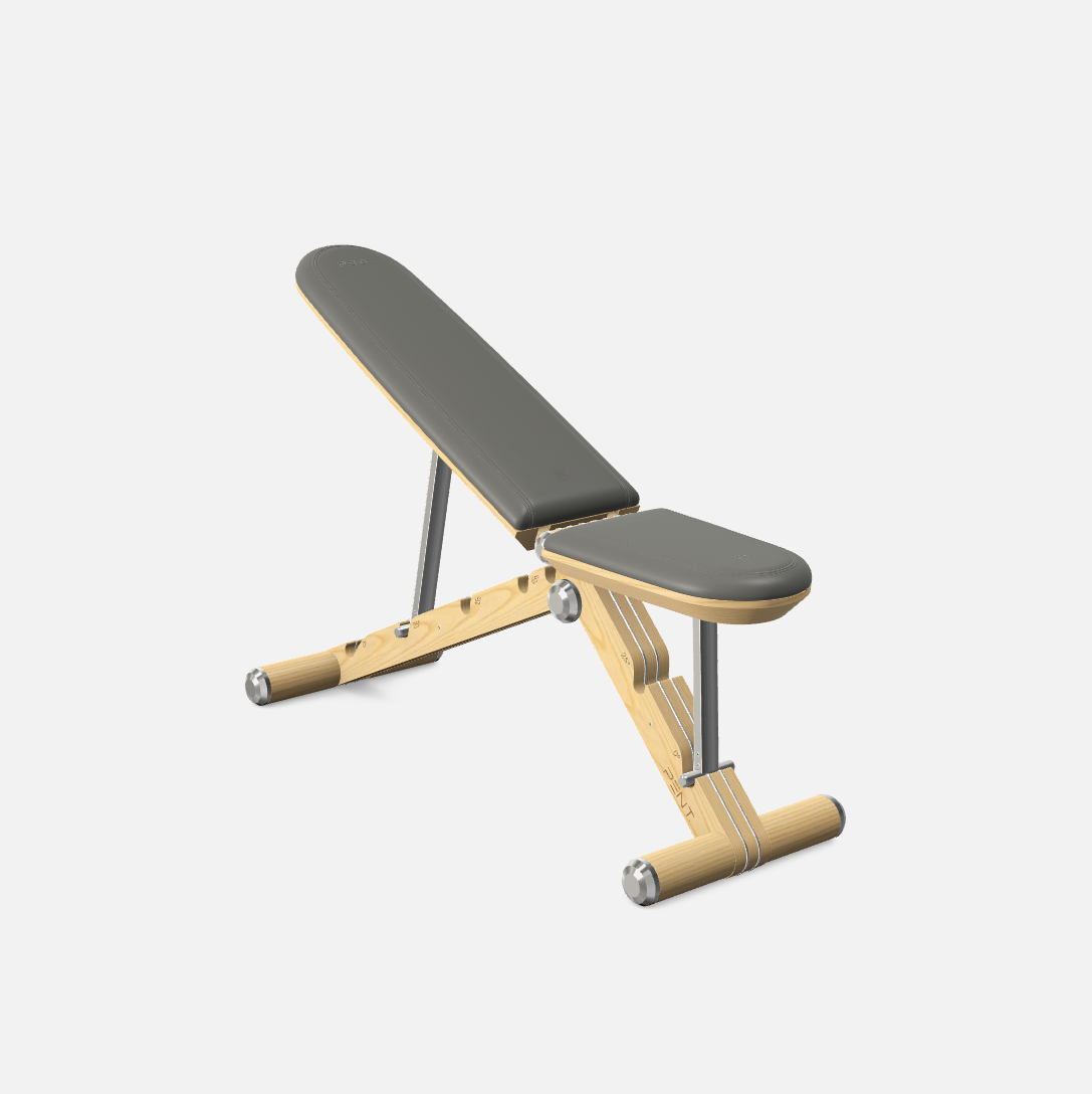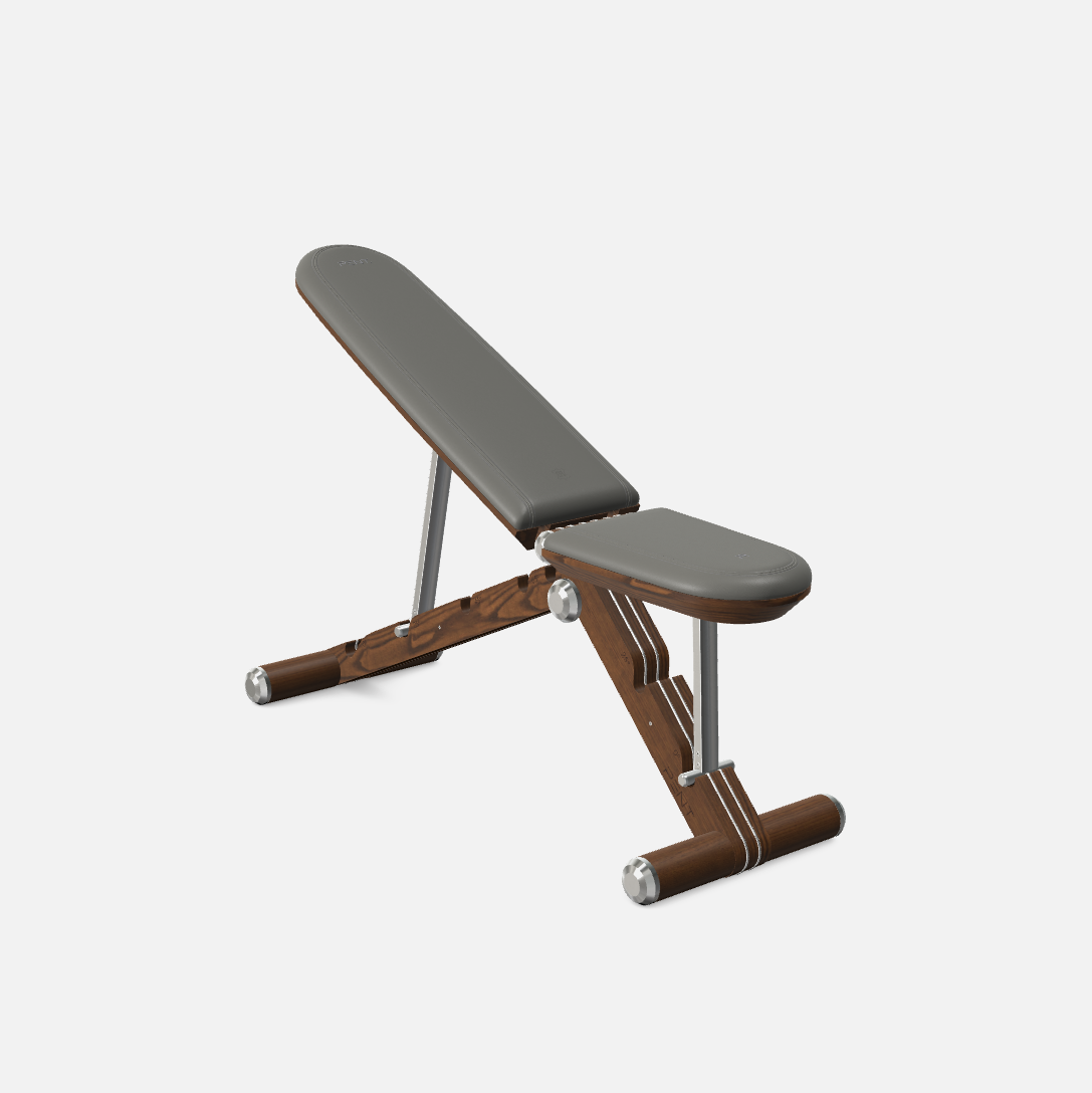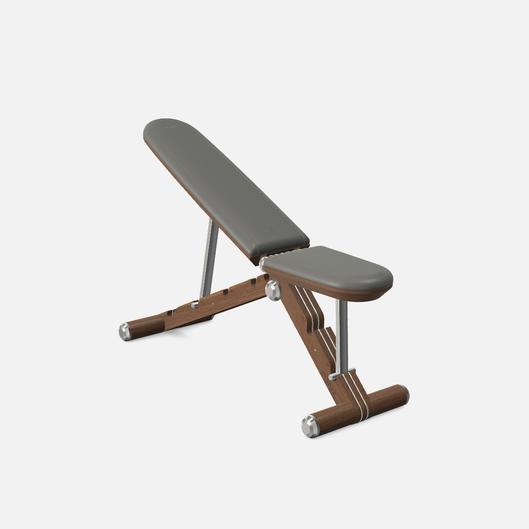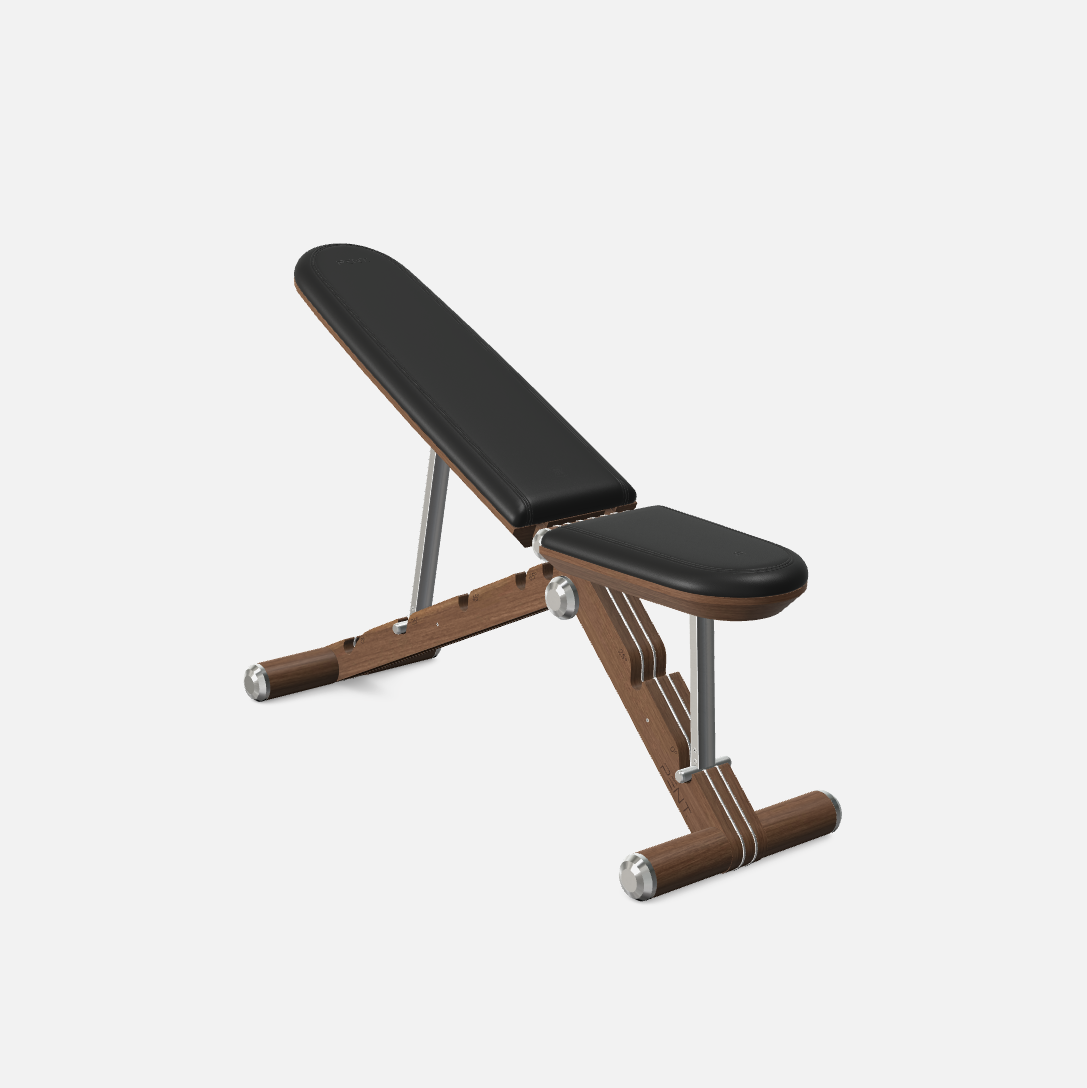 A modern and sleek adjustable lifting bench, with a wood and stainless steel core. Back adjusts to 4 positions, seat adjusts to 2 positions. Used for flat and incline bench press exercises.