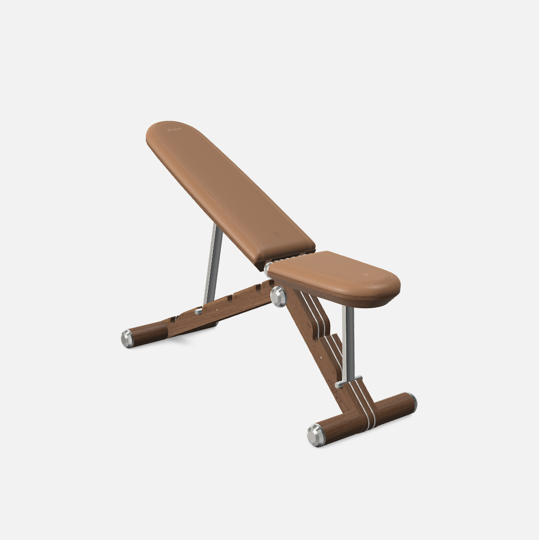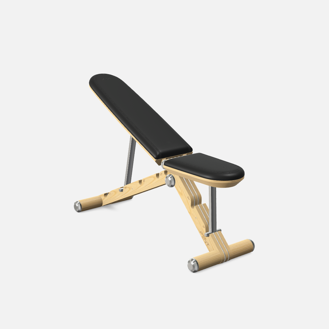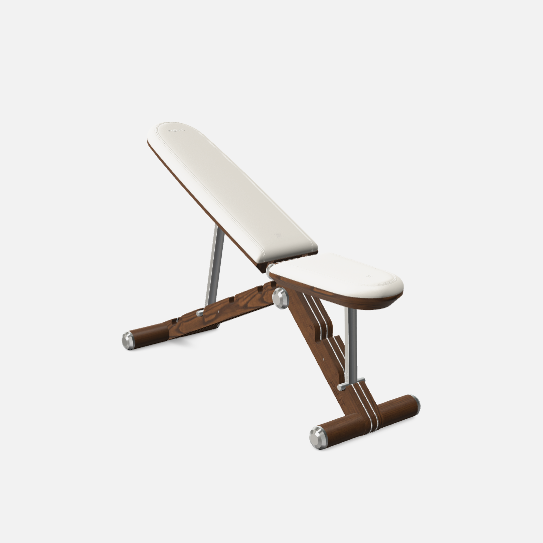 A modern and sleek adjustable lifting bench, with a wood and stainless steel core. Back adjusts to 4 positions, seat adjusts to 2 positions. Used for flat and incline bench press exercises.