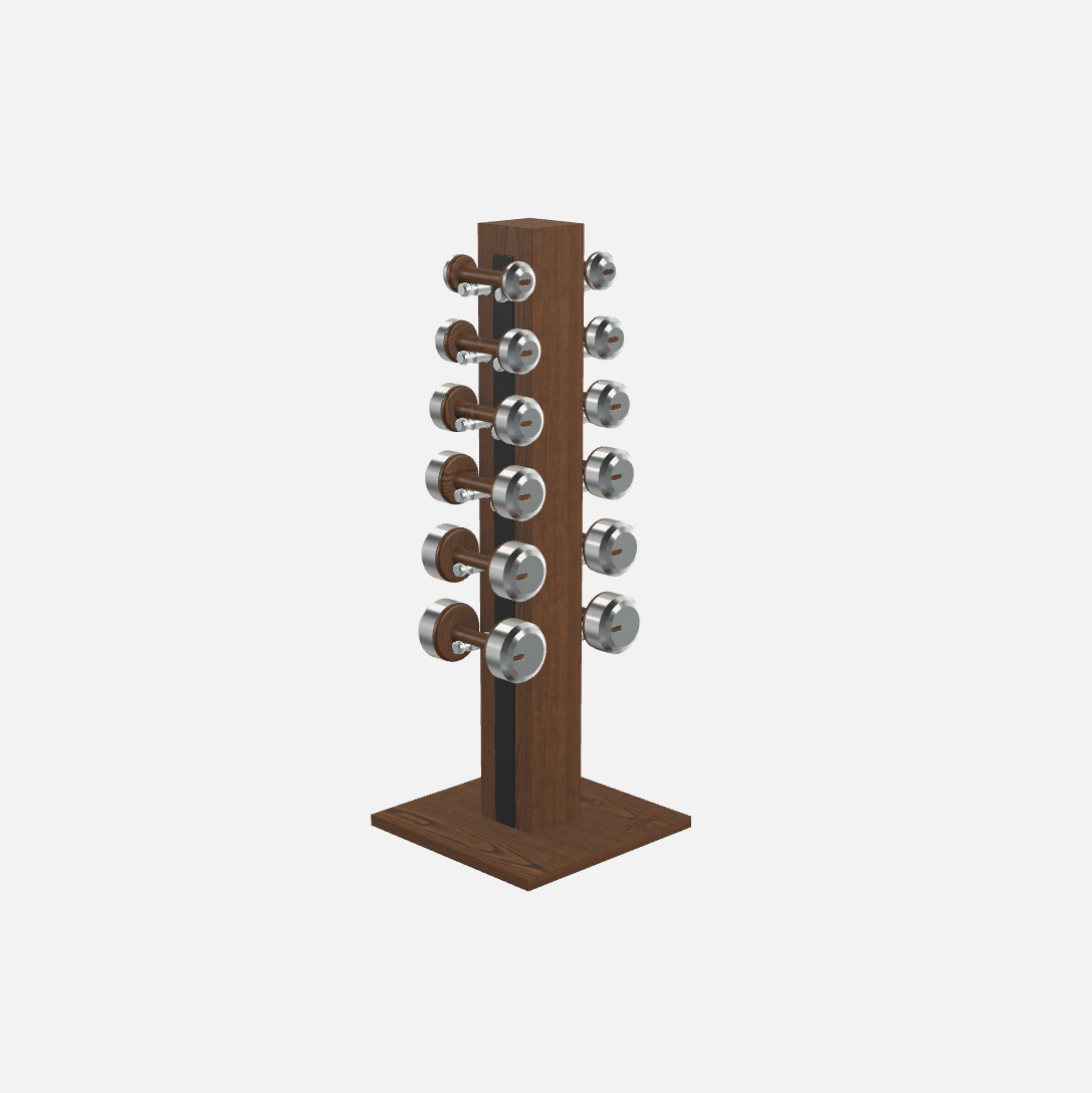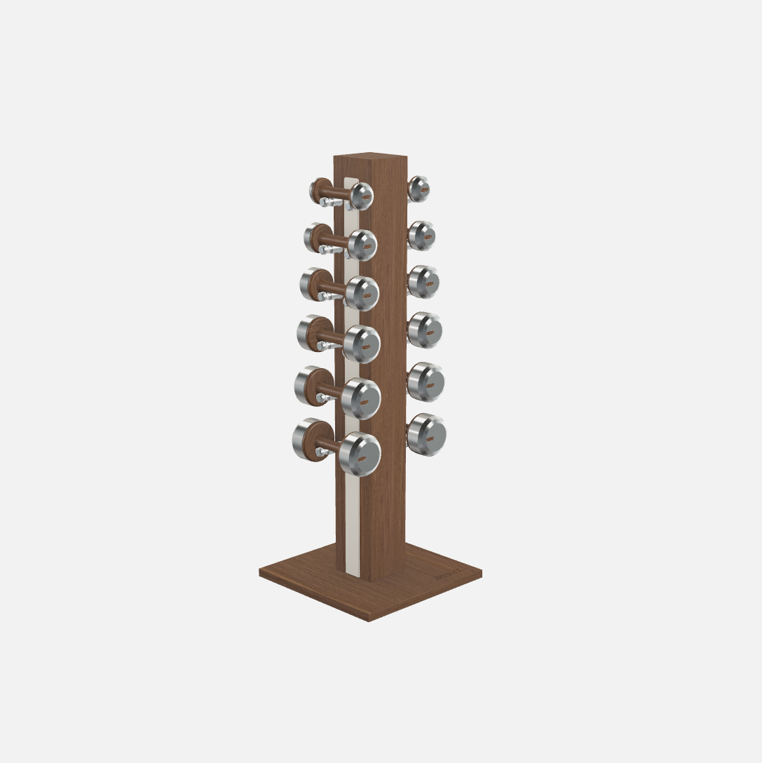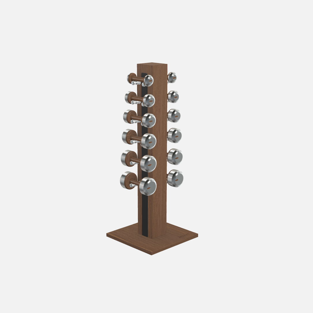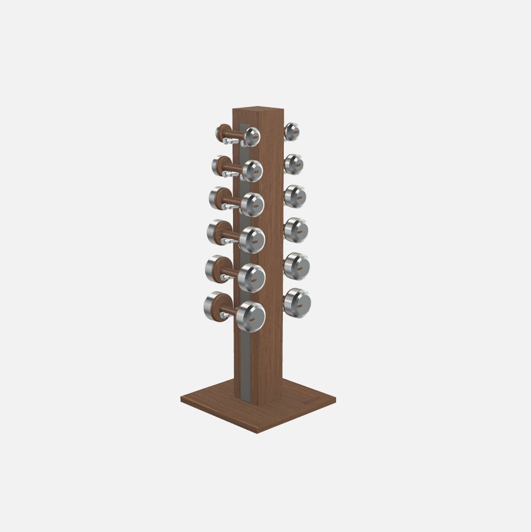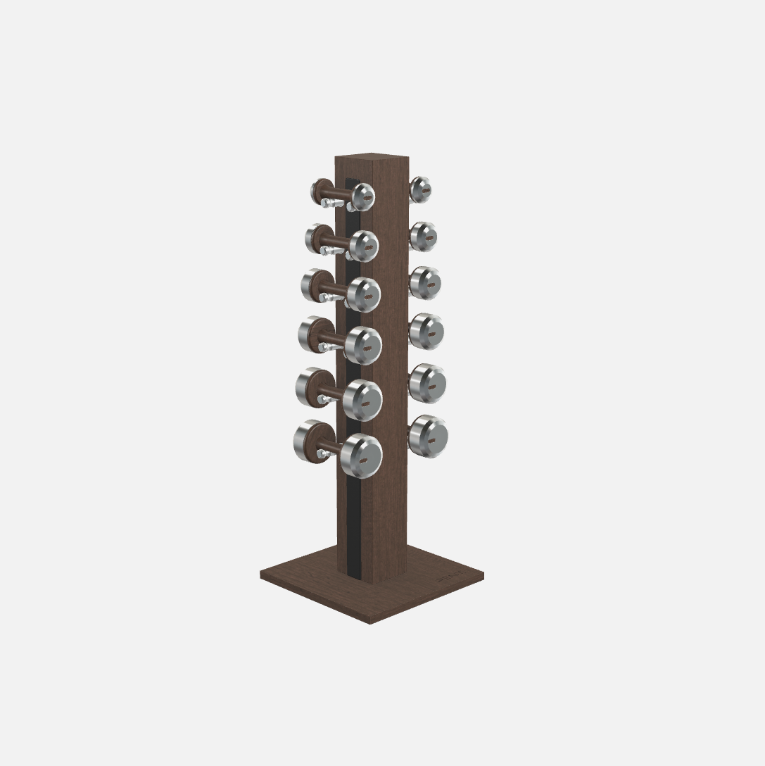 A vertical dumbbell set made from the highest quality materials manually crafted. Light version. Made to order in Europe. A range of dumbbells available in walnut or ash in the grips and tower. Select your leather finish for the tower dumbbell inserts.