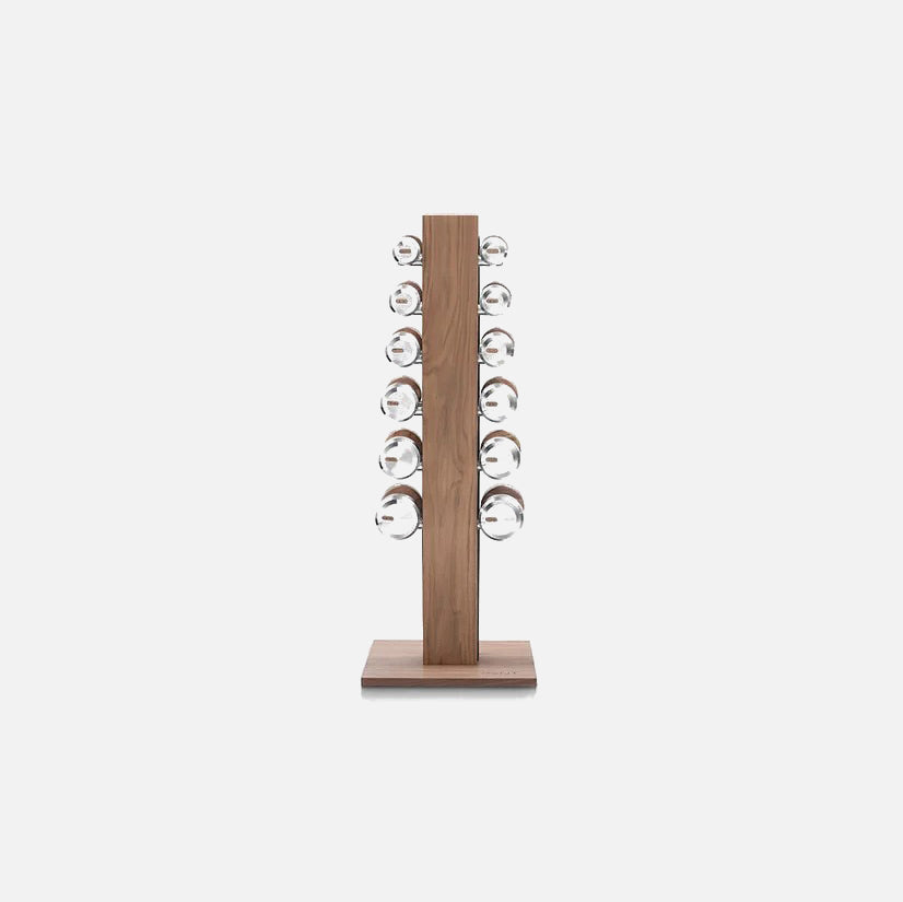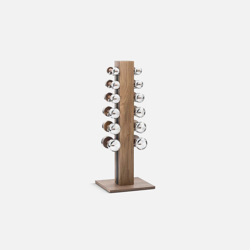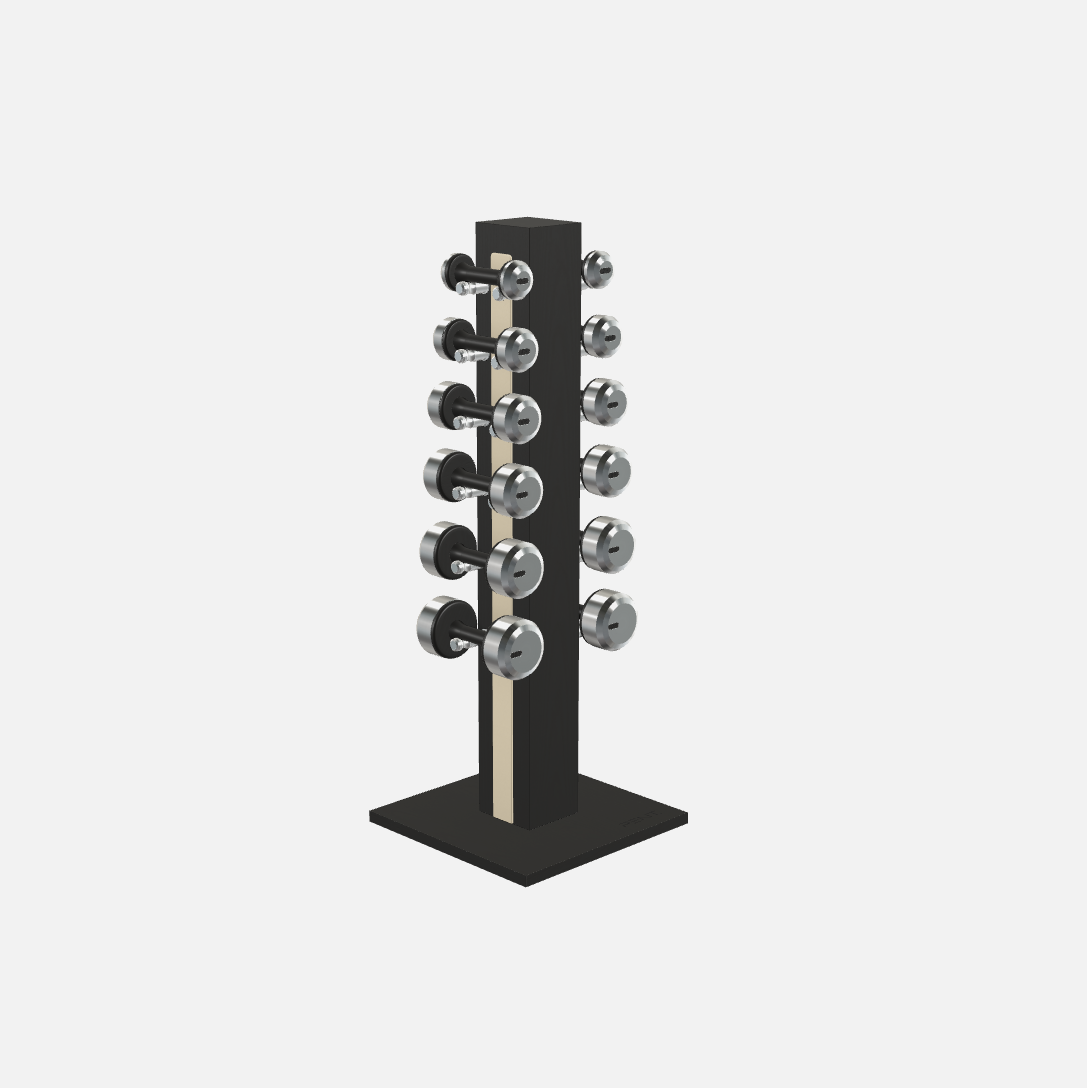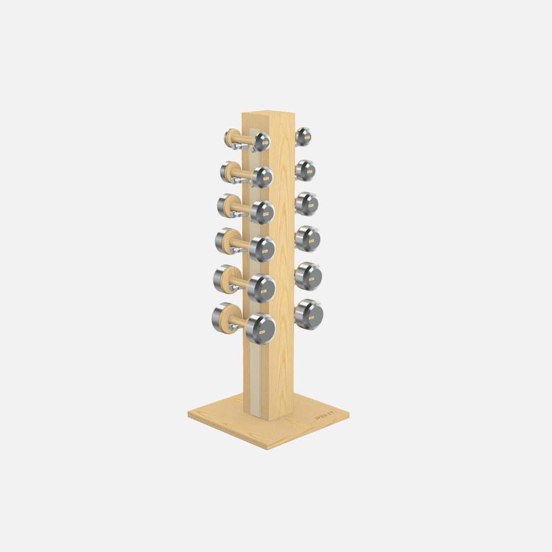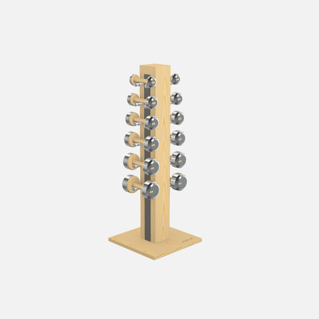 A vertical dumbbell set made from the highest quality materials manually crafted. Light version. Made to order in Europe. A range of dumbbells available in walnut or ash in the grips and tower. Select your leather finish for the tower dumbbell inserts.