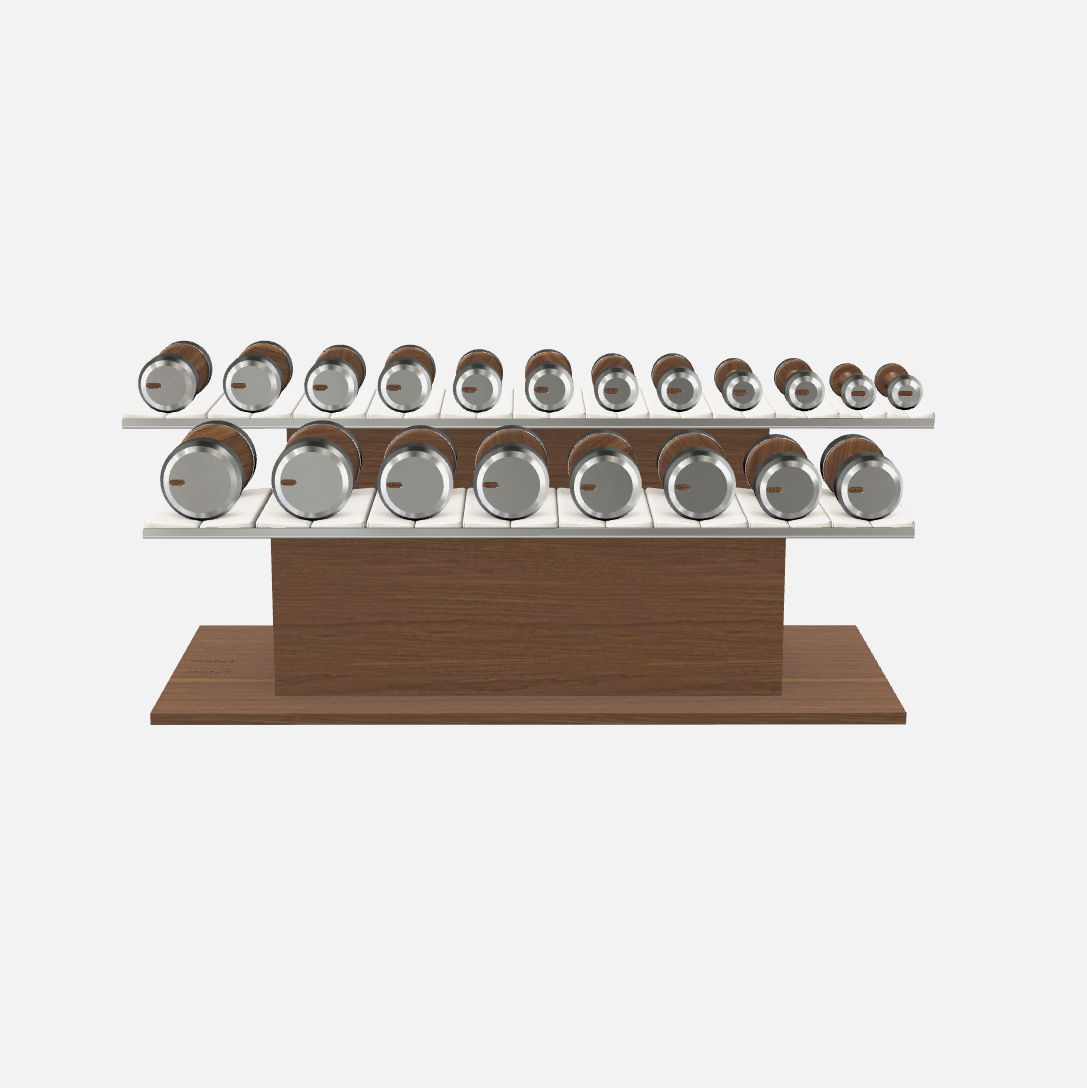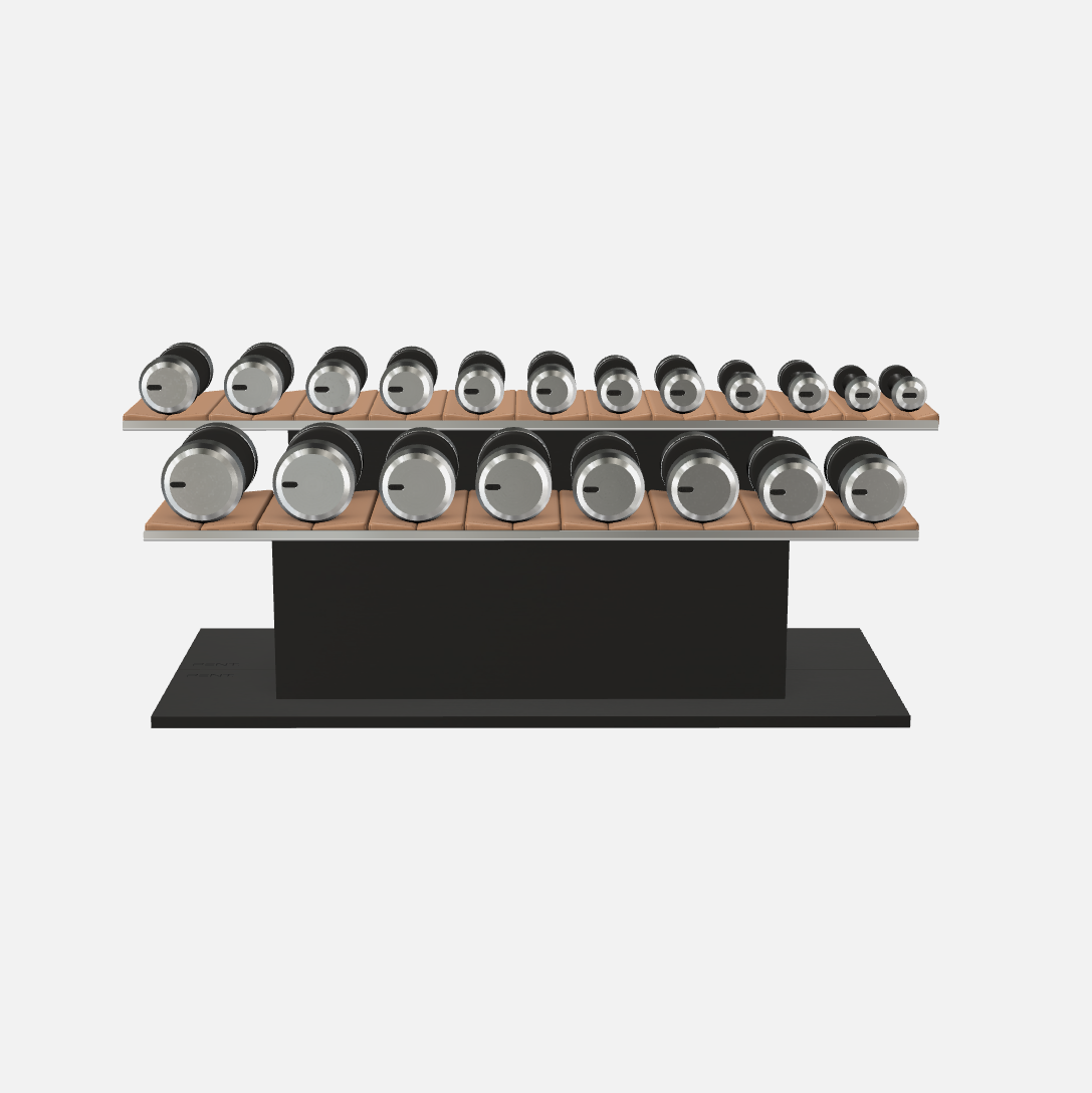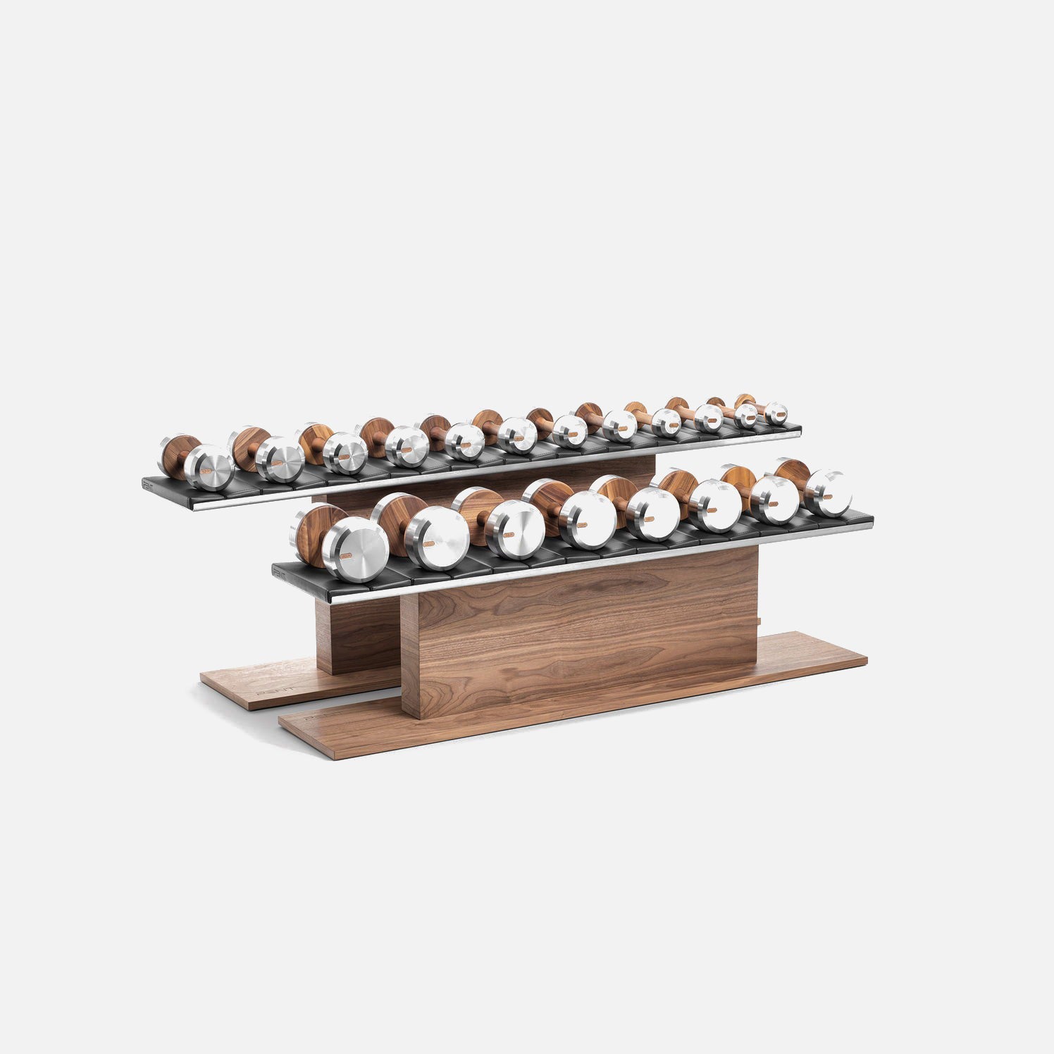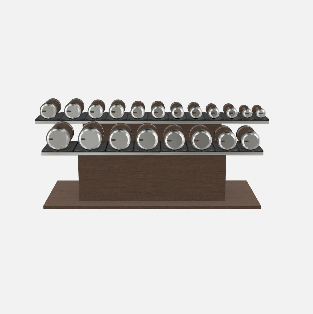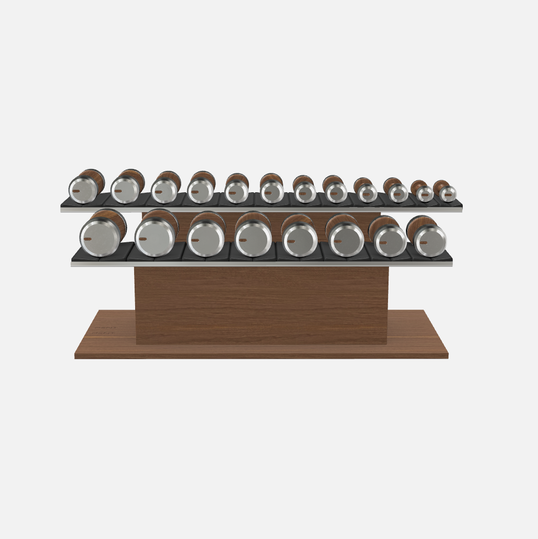 A dumbbell set made from the highest quality materials manually crafted. Complete version. Made to order in Europe. A range of dumbbells available in walnut or ash in the grips and weight shelf. Select your leather finish for the weight shelf.