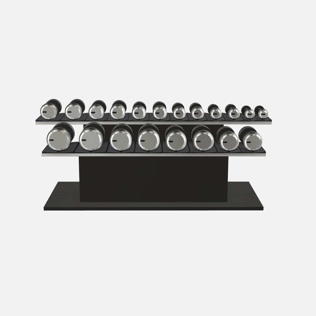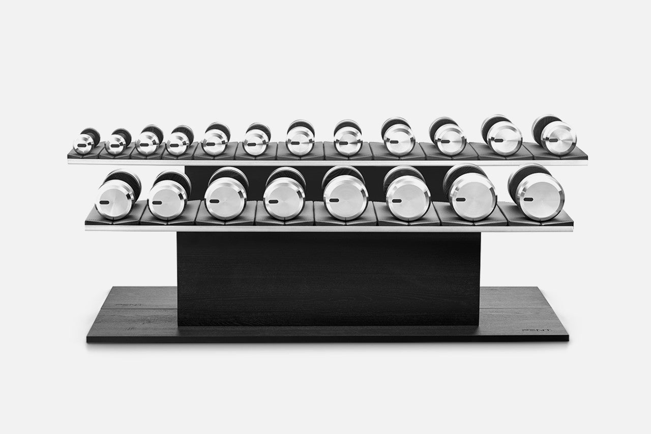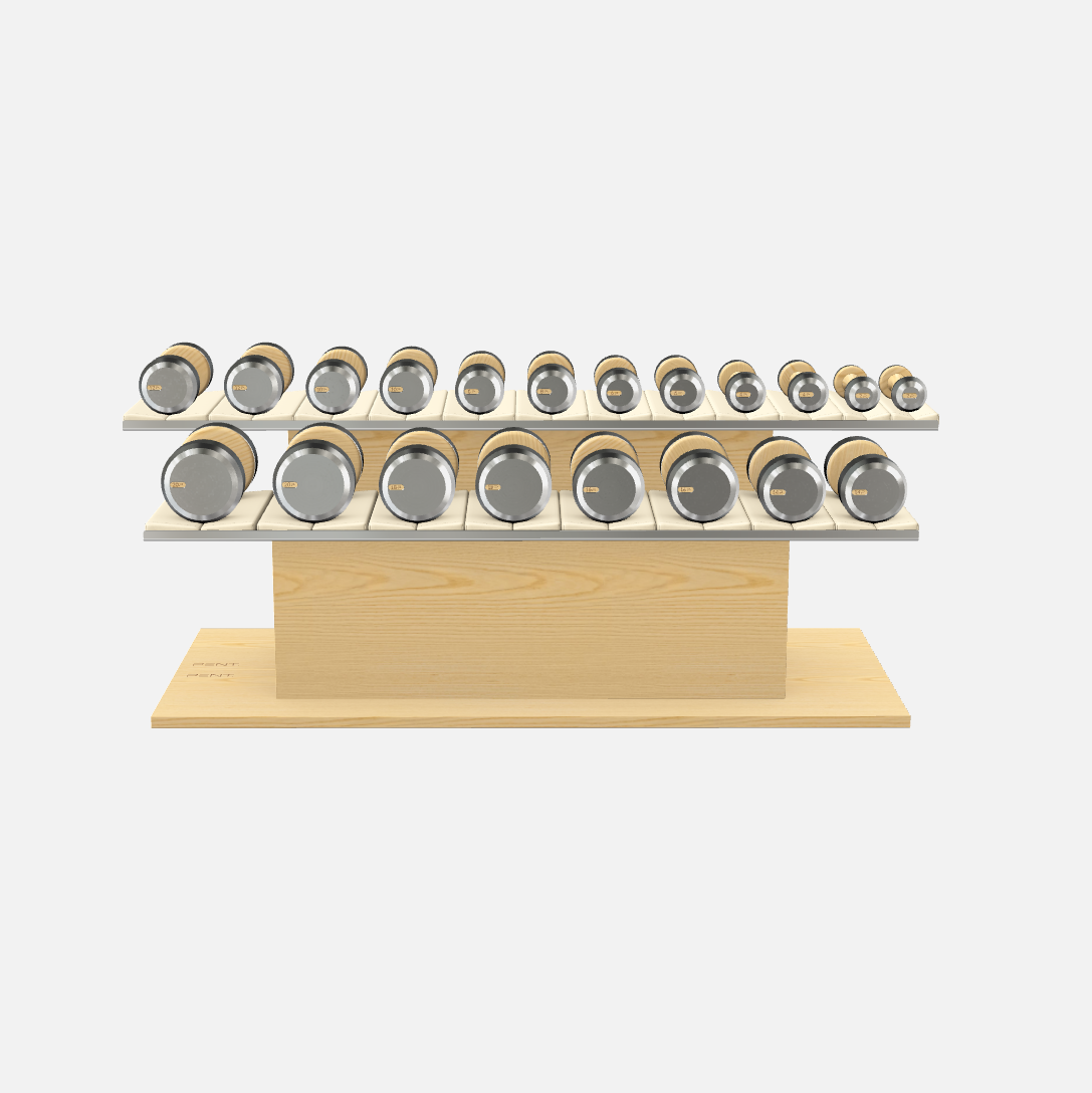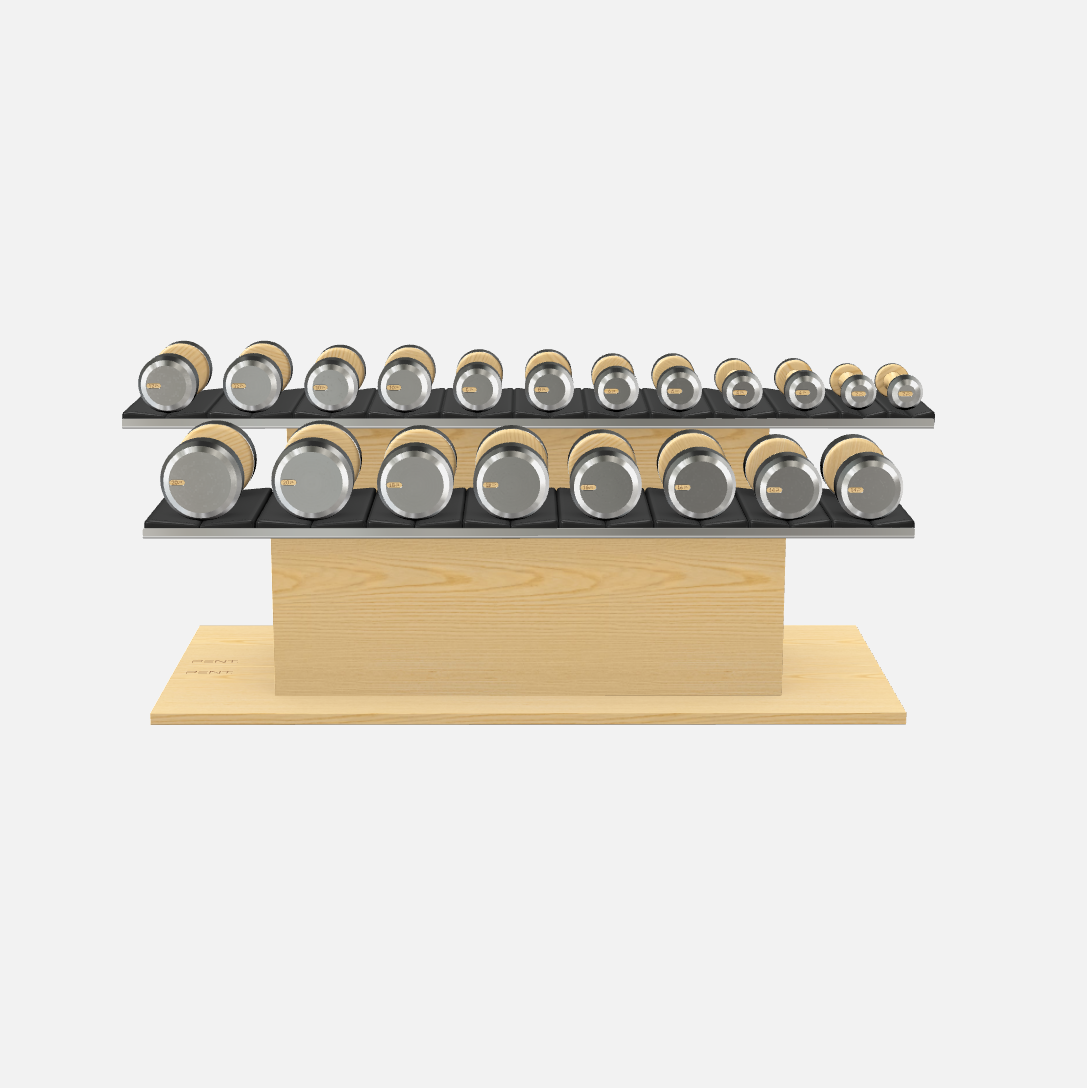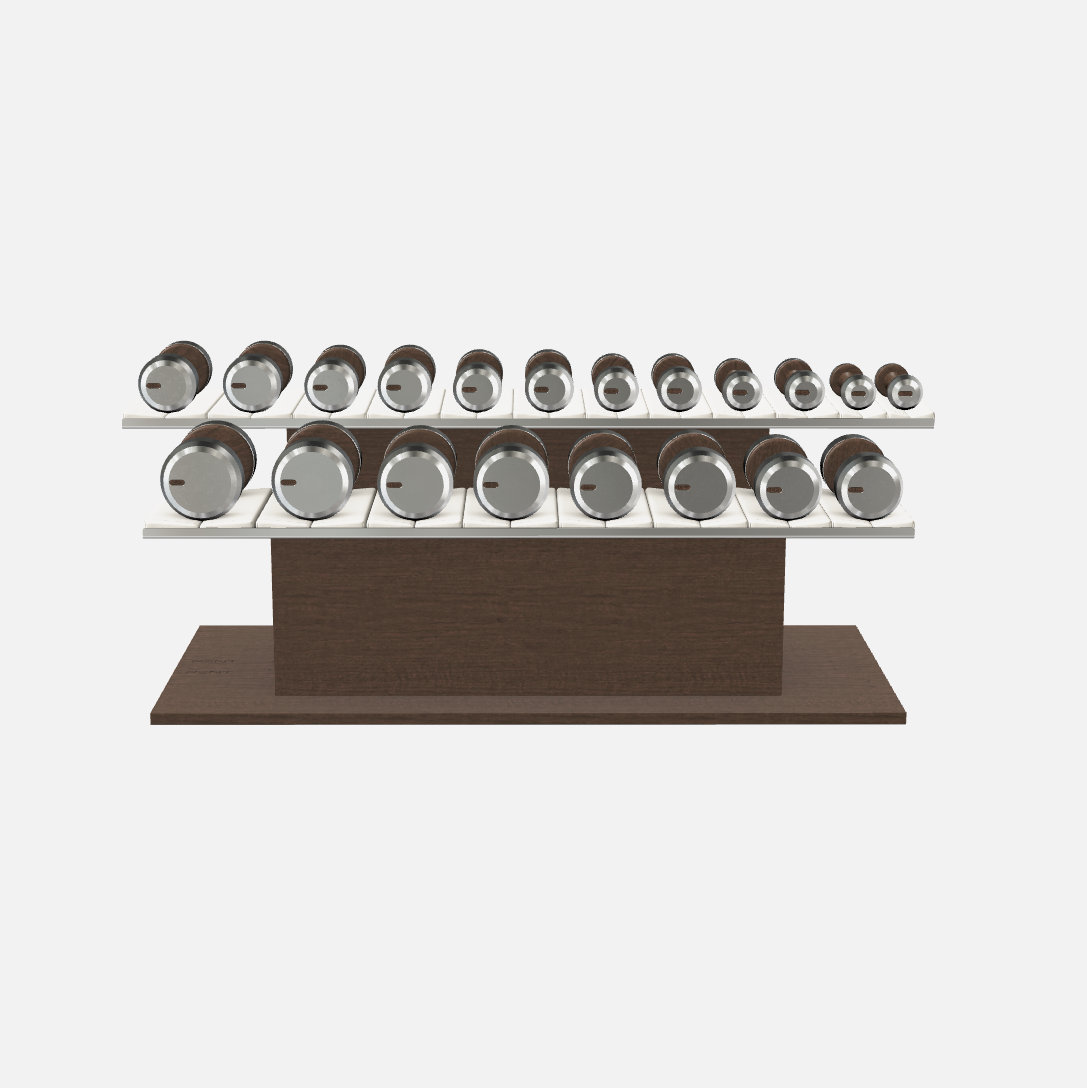 A dumbbell set made from the highest quality materials manually crafted. Complete version. Made to order in Europe. A range of dumbbells available in walnut or ash in the grips and weight shelf. Select your leather finish for the weight shelf.