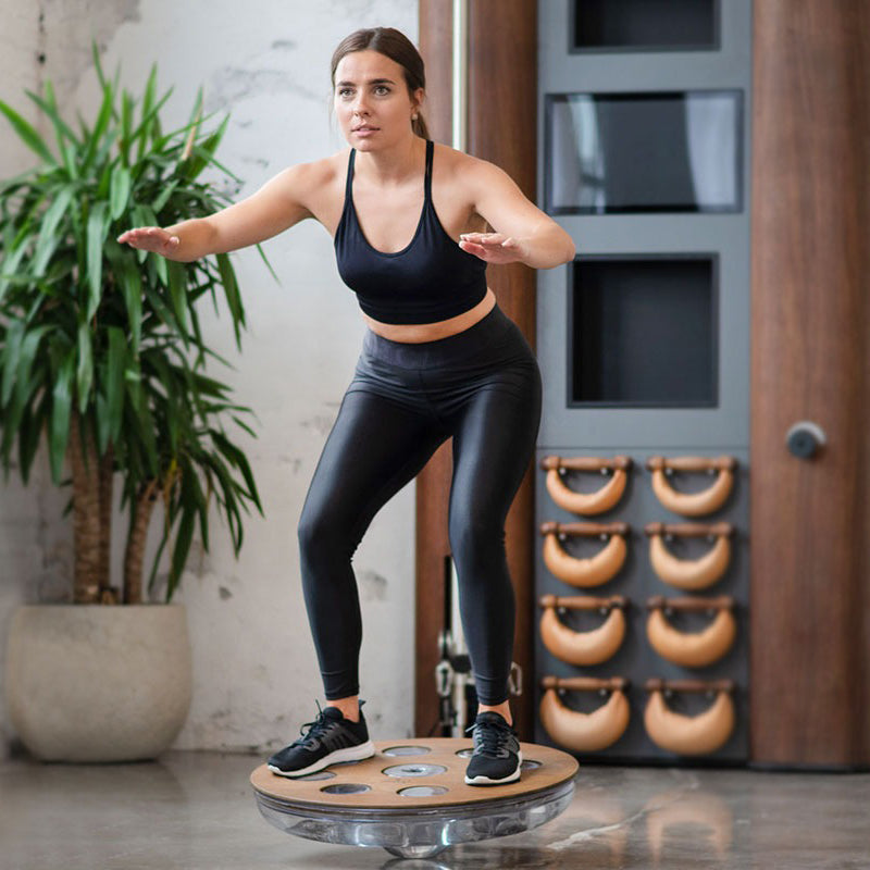 Use for training exercises such as squats, sit-ups, lunges, and push-ups. Performing these exercises on the balance board encourages the body to use its stabilizing muscles to maintain balance, while also significantly challenging large muscle groups with its unstable platform.