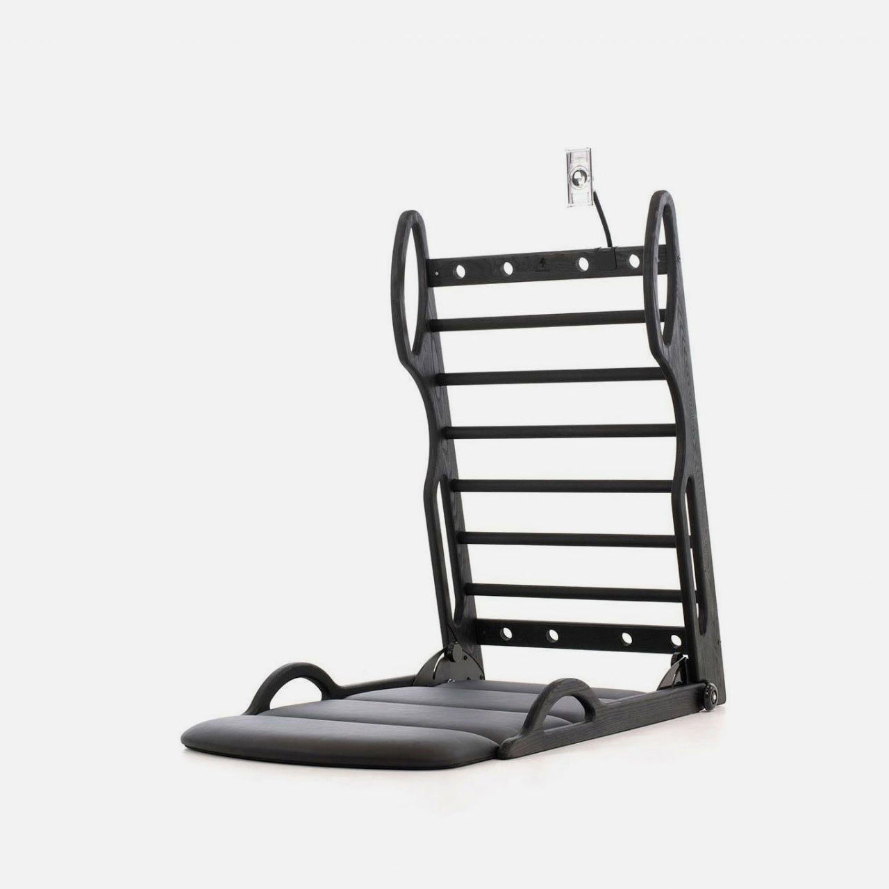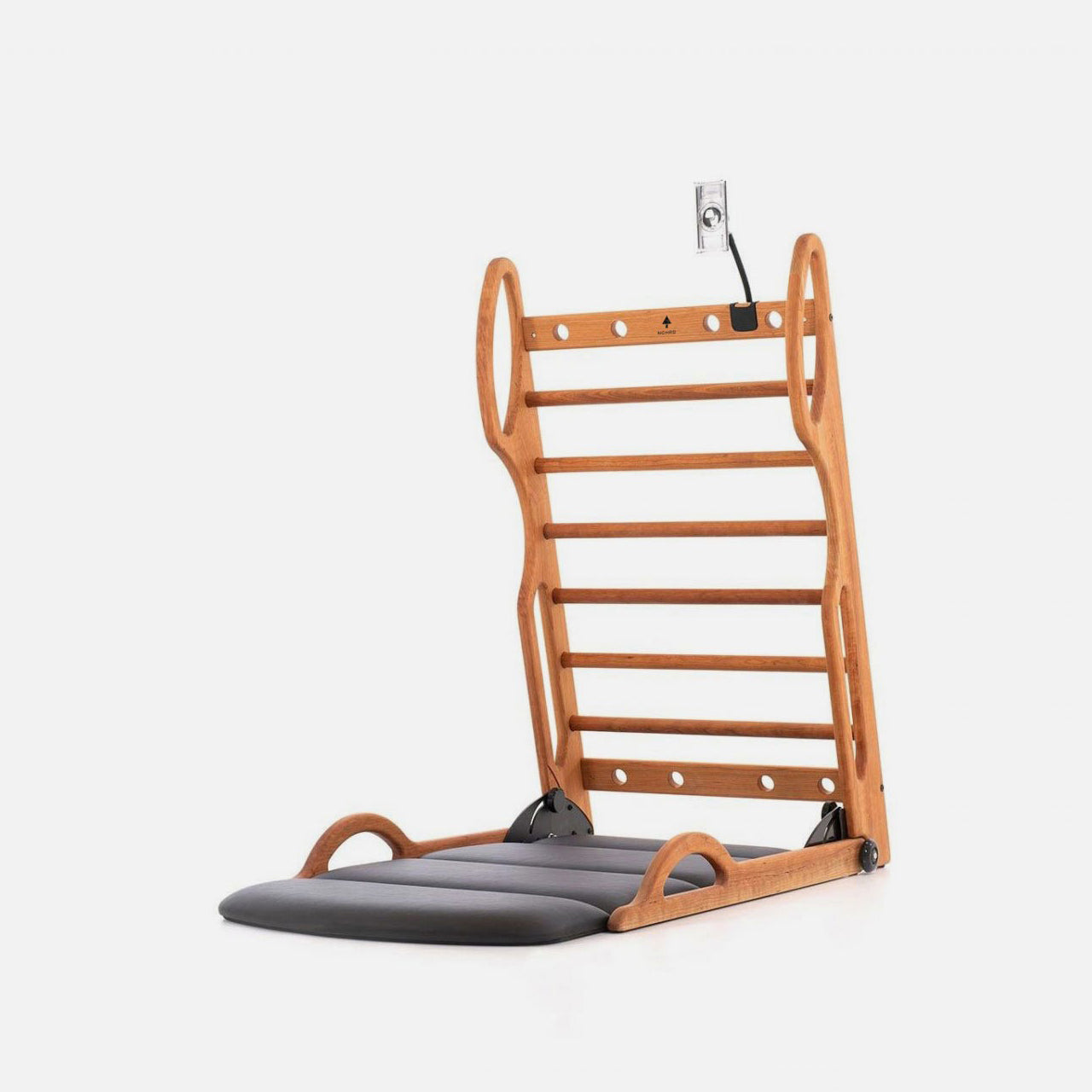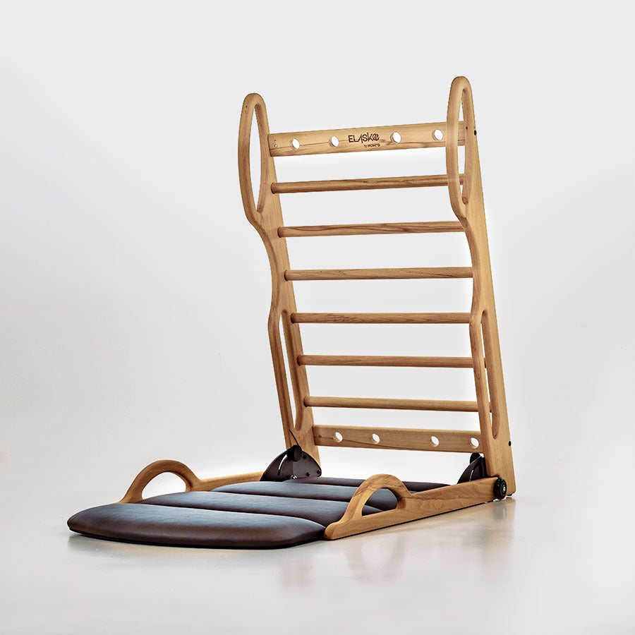The fold-out upholstered exercise mat comes in both genuine or artificial leather options. The design ensures safe standing and extra comfort during prone or holding exercise positions. Six smooth, solid wood rungs are spaced to support and challenge various levels of flexibility during your stretch session. The NOHRD ELASKO bars feature a total of six side loops for optimal handle options during your training session, enabling you more precision for performing special deep tissue exercises.