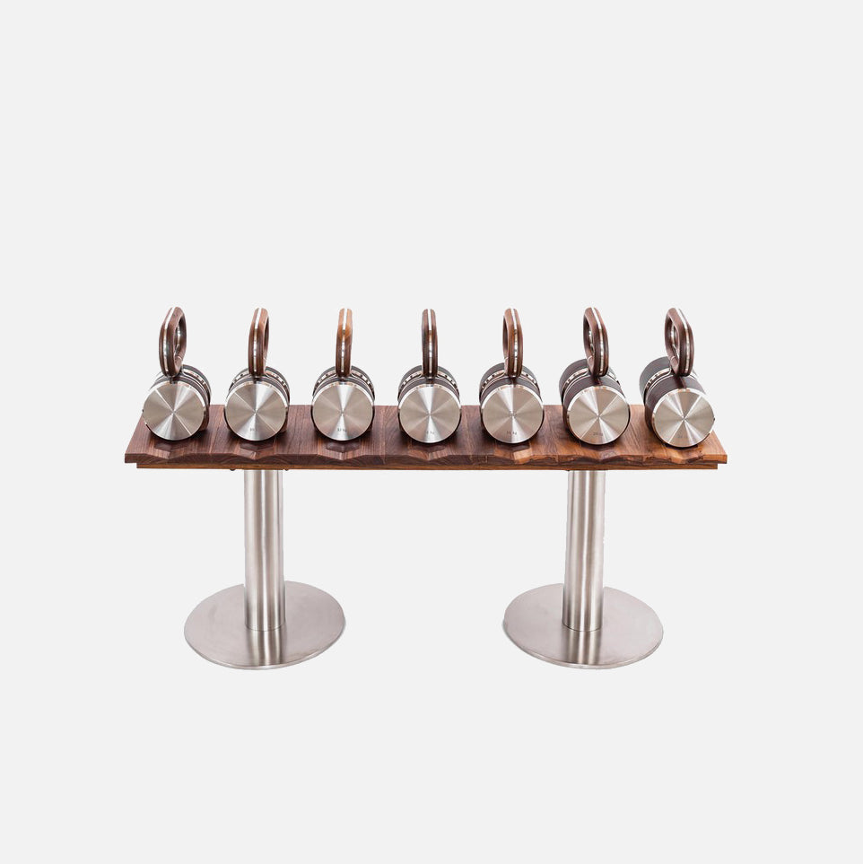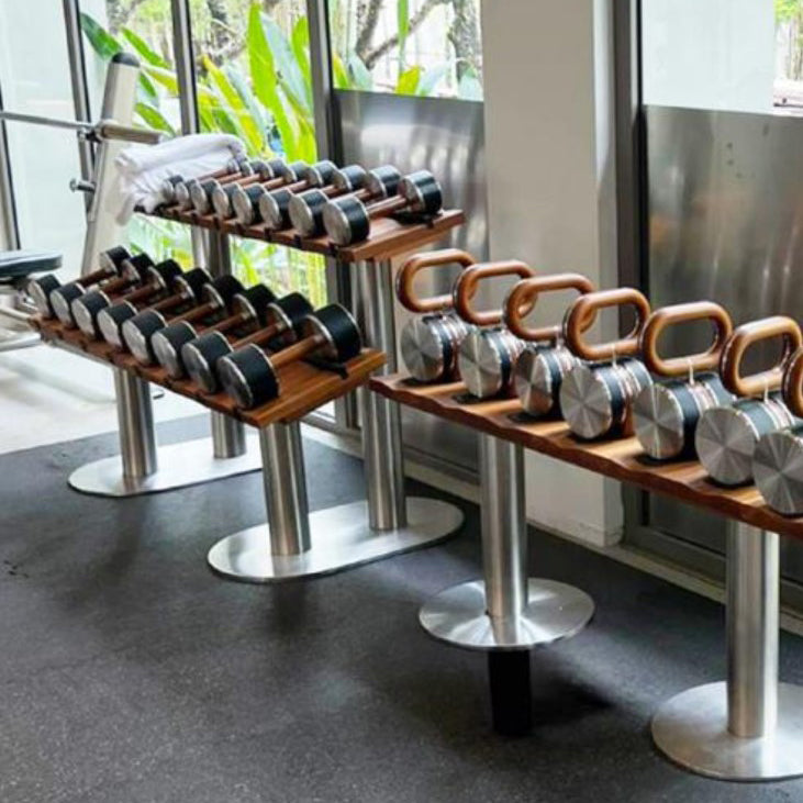 The horizontal kettlebell rack transforms traditional storage into an expression of refined design, lifting your kettlebells from floor to display-worthy heights. This sophisticated solution honors your equipment while enhancing your space with elegant functionality. Standard configuration accommodates 7 kettlebells ranging from 8-24 kg, with custom options available to suit your specific needs.