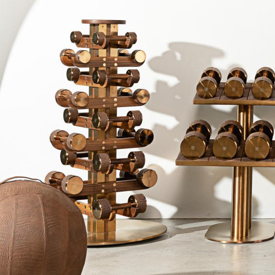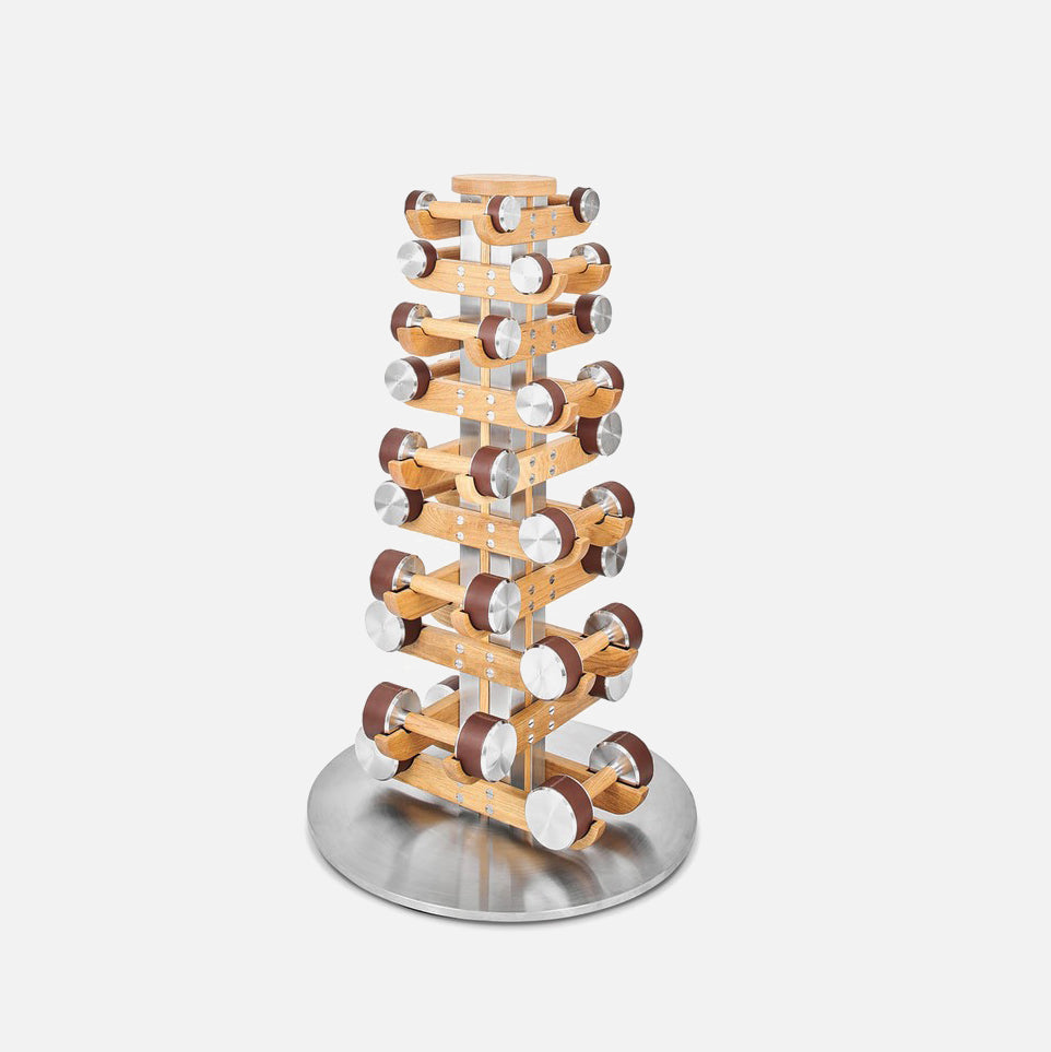 This versatile dumbbell tower marries innovative design with thoughtful functionality, featuring custom-fitted wooden arms that cradle each weight with precision. Its 360-degree rotating base ensures effortless access from any angle, even in corner placements, while creating an architectural focal point in your space. Standard configuration includes 10 pairs ranging from 1-10 kg, with custom options available to suit your specific needs.