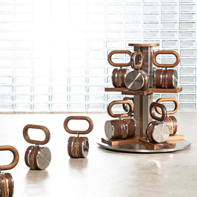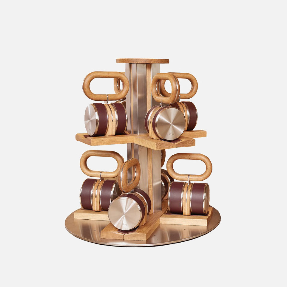 The vertical kettlebell tower maximizes storage efficiency through innovative engineering, featuring a rotating base and precisely crafted wooden arms that overlap to optimize space. This sophisticated design creates an architectural focal point while housing your equipment, proving that functional storage can enhance your space. Standard configuration accommodates 8 kettlebells ranging from 6-24 kg, with custom options available to suit your specific needs.