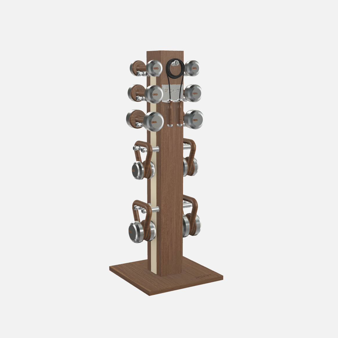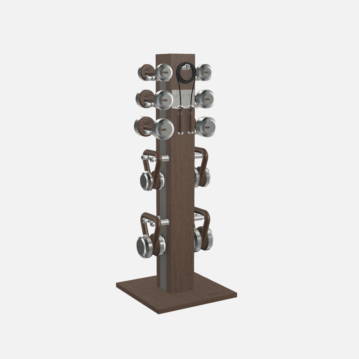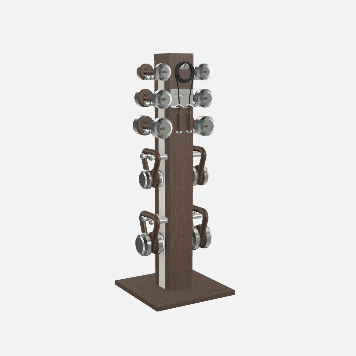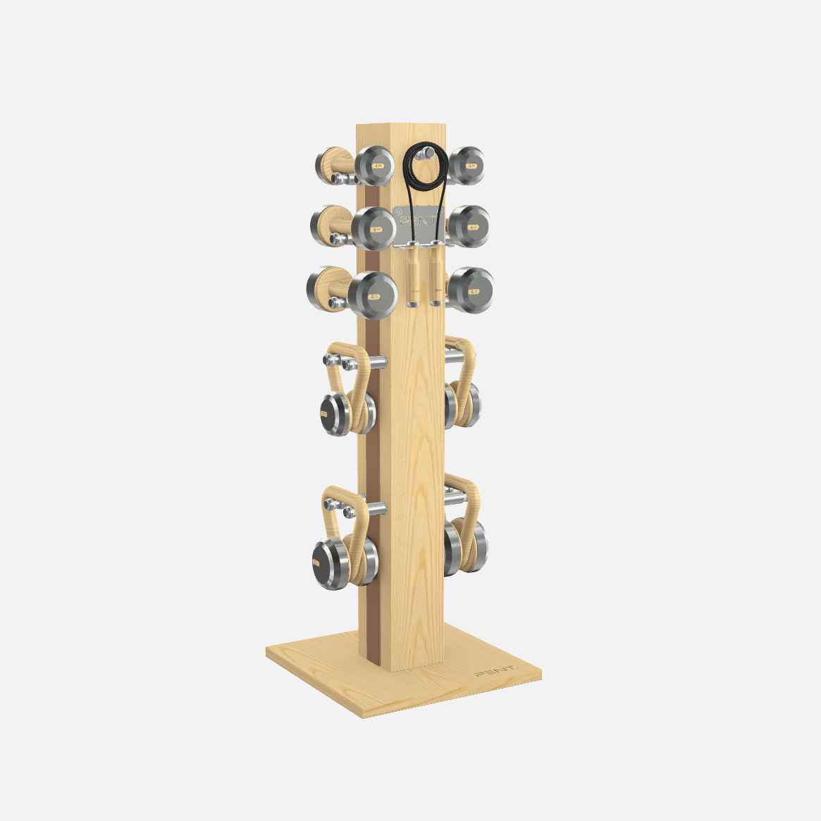 The PENT ISA combines elegant design with versatile fitness functionality. This premium equipment stand artfully displays a curated set of dumbbells and kettlebells, complemented by the sophisticated Sienna jump rope. Its thoughtful, space-efficient design seamlessly integrates into upscale environments – from private residences to boutique hotels and luxury fitness spaces. More than exercise equipment, the ISA™ transforms fitness gear into a sculptural statement piece that elevates any interior's aesthetic.