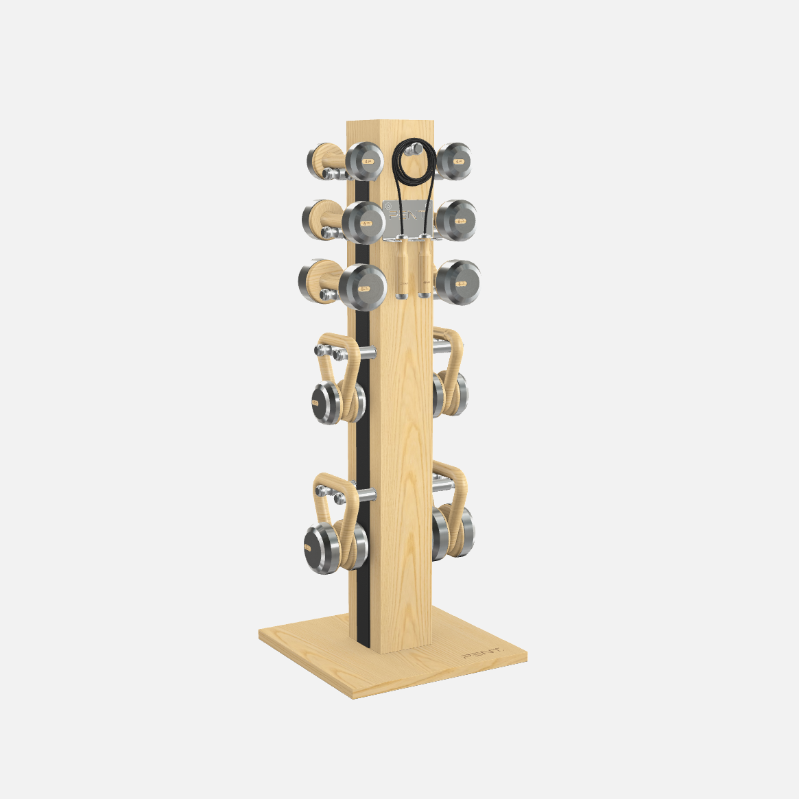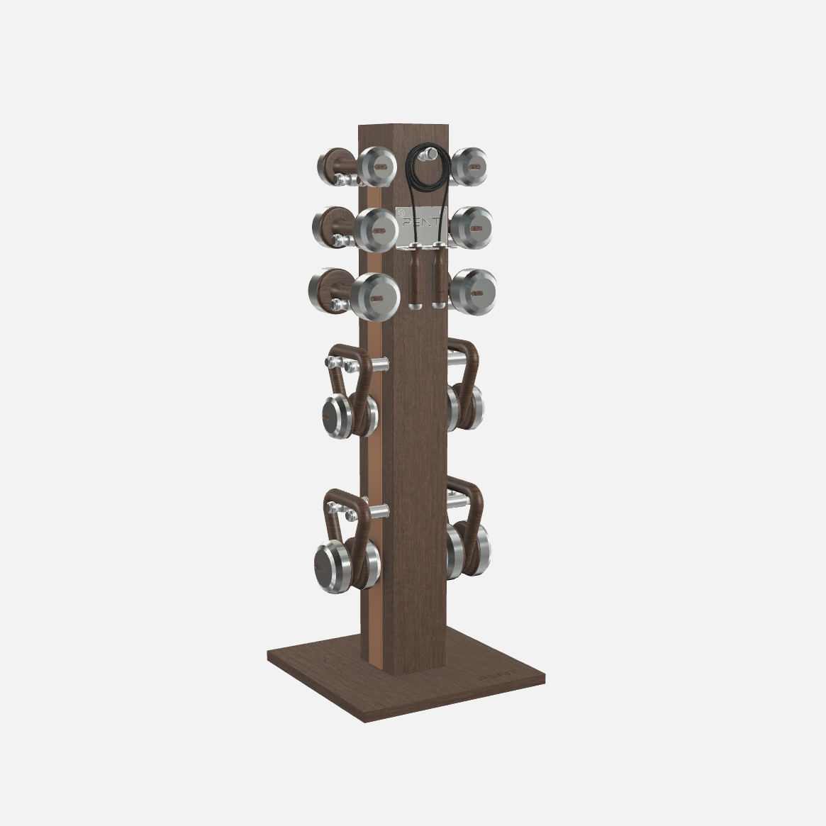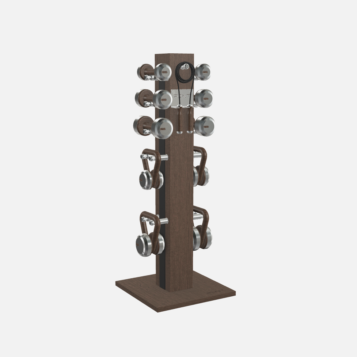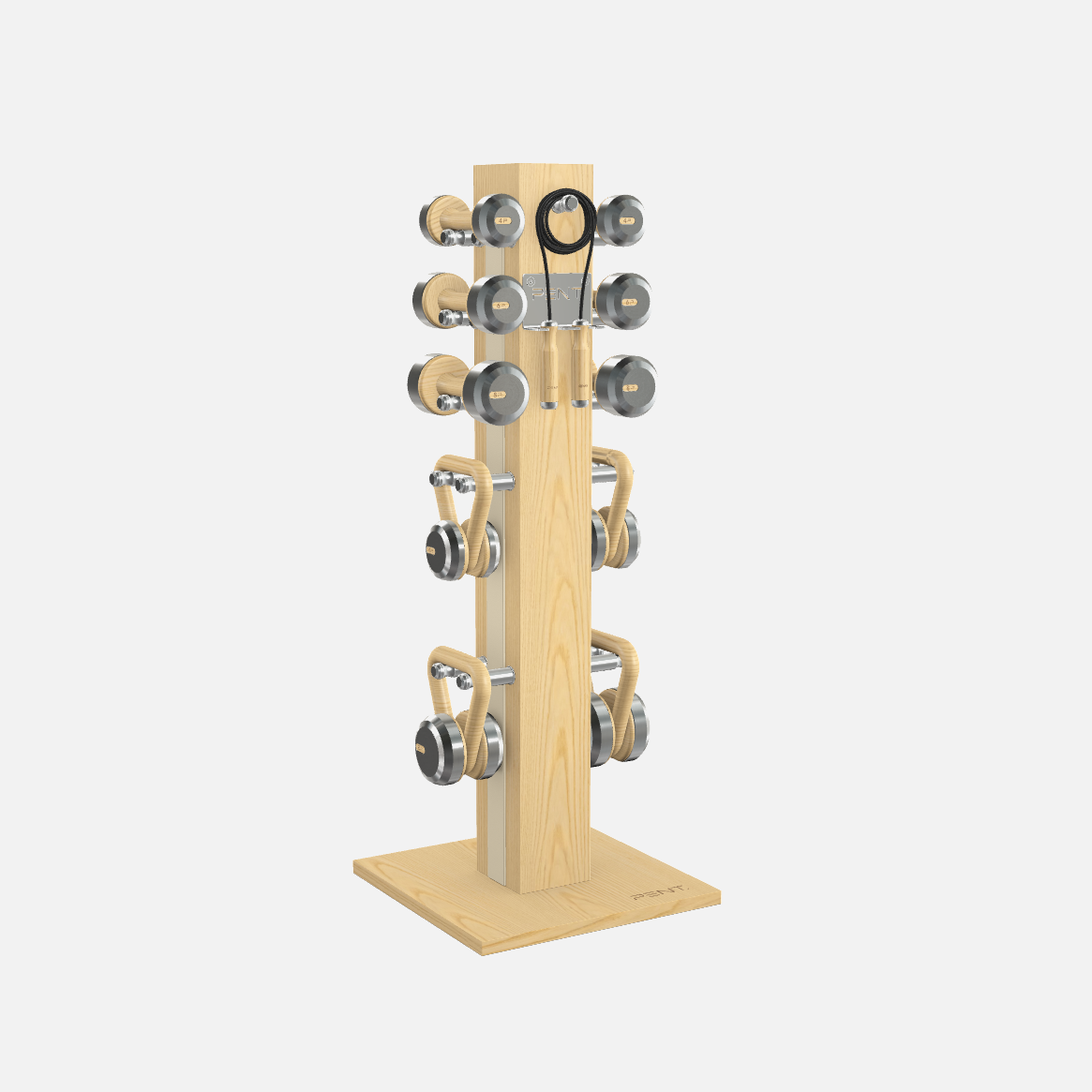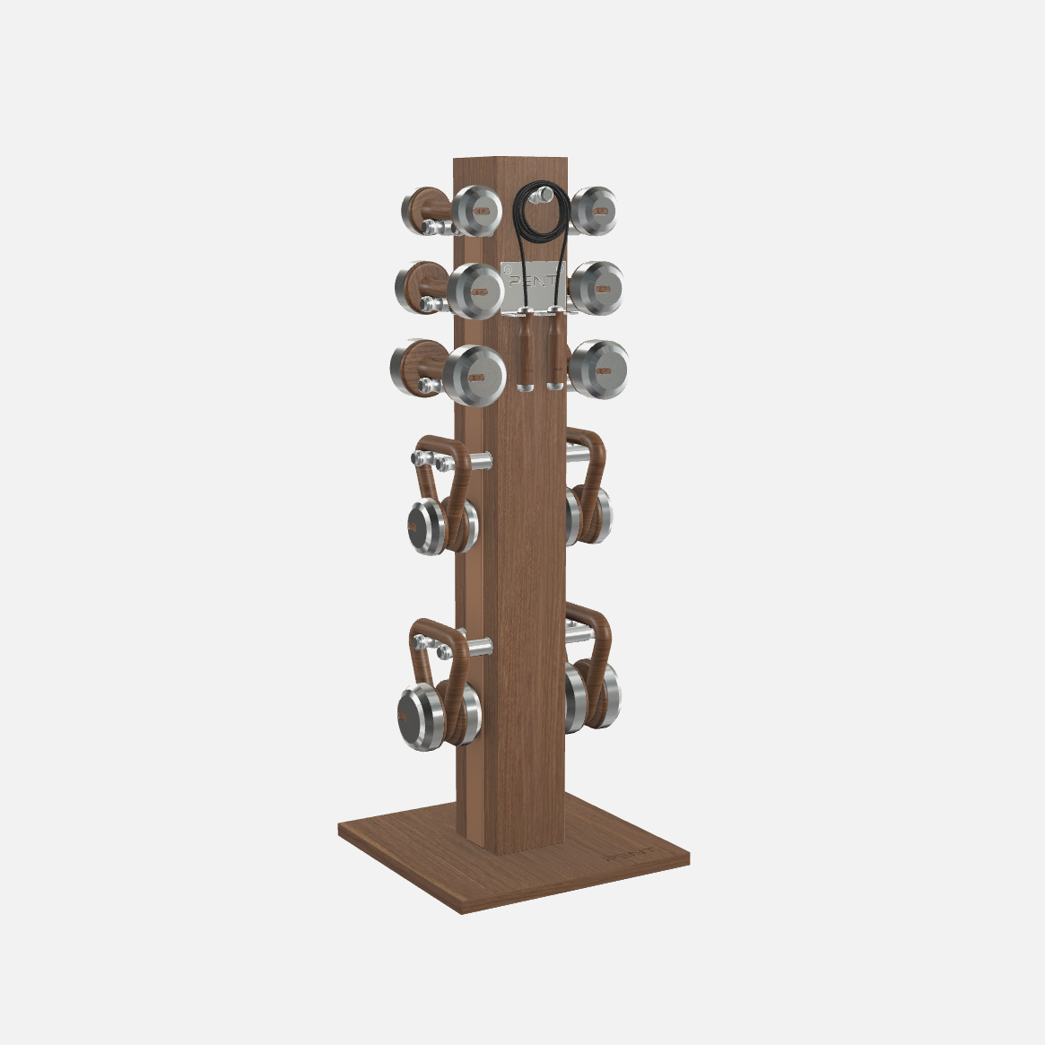 The PENT ISA combines elegant design with versatile fitness functionality. This premium equipment stand artfully displays a curated set of dumbbells and kettlebells, complemented by the sophisticated Sienna jump rope. Its thoughtful, space-efficient design seamlessly integrates into upscale environments – from private residences to boutique hotels and luxury fitness spaces. More than exercise equipment, the ISA™ transforms fitness gear into a sculptural statement piece that elevates any interior's aesthetic.