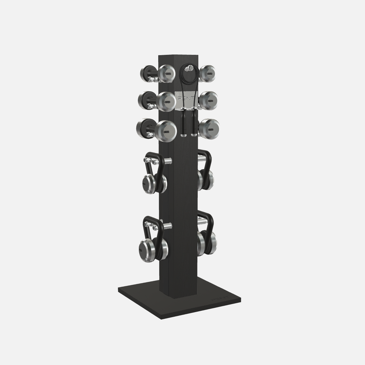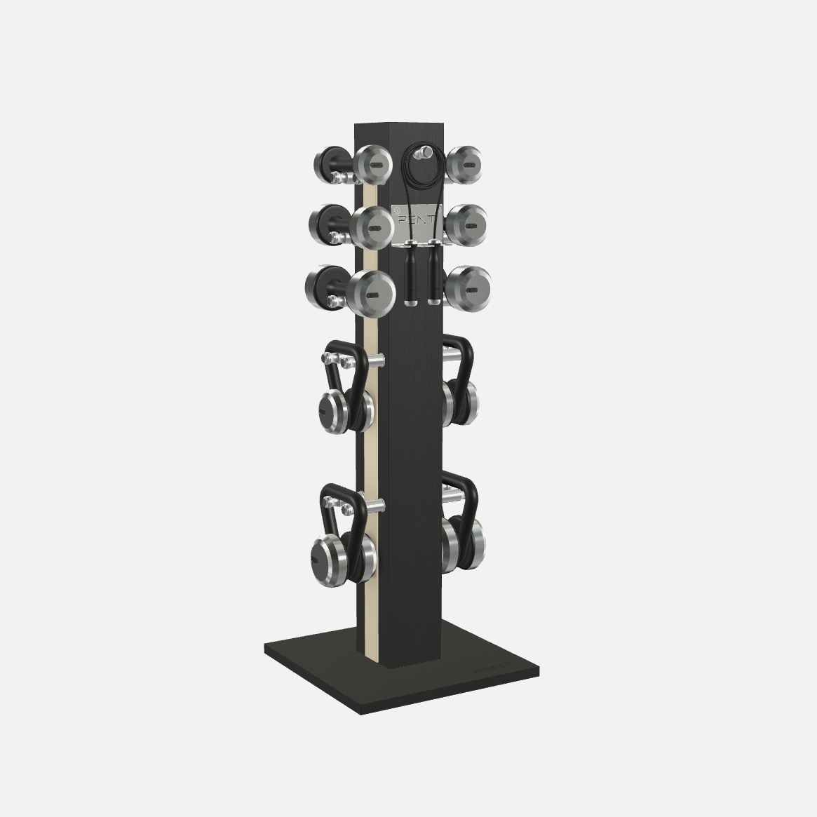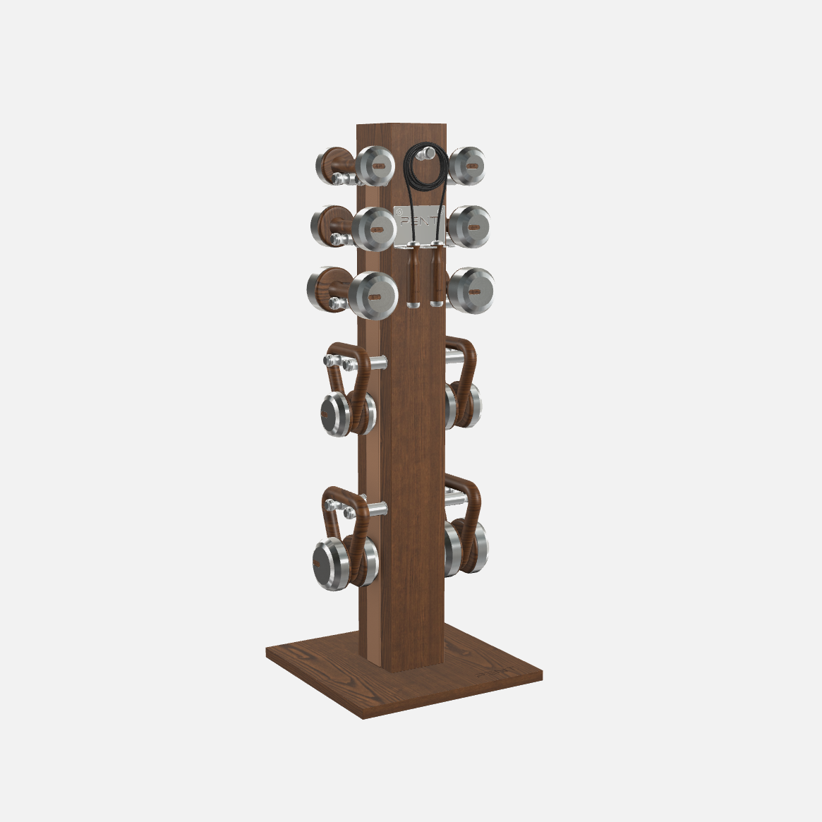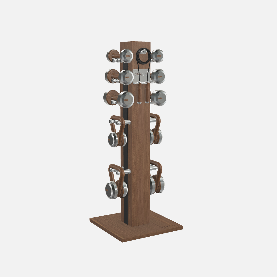 The PENT ISA combines elegant design with versatile fitness functionality. This premium equipment stand artfully displays a curated set of dumbbells and kettlebells, complemented by the sophisticated Sienna jump rope. Its thoughtful, space-efficient design seamlessly integrates into upscale environments – from private residences to boutique hotels and luxury fitness spaces. More than exercise equipment, the ISA™ transforms fitness gear into a sculptural statement piece that elevates any interior's aesthetic.