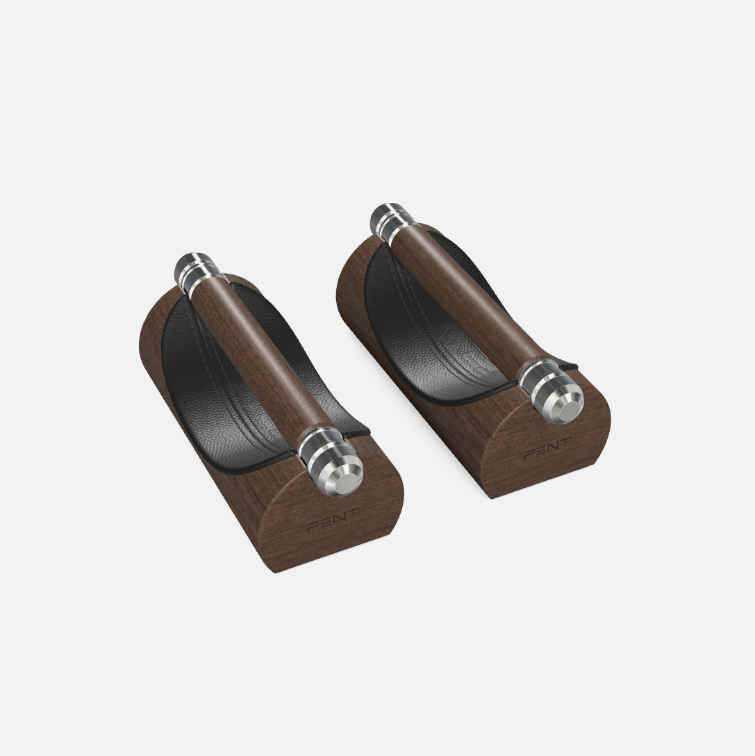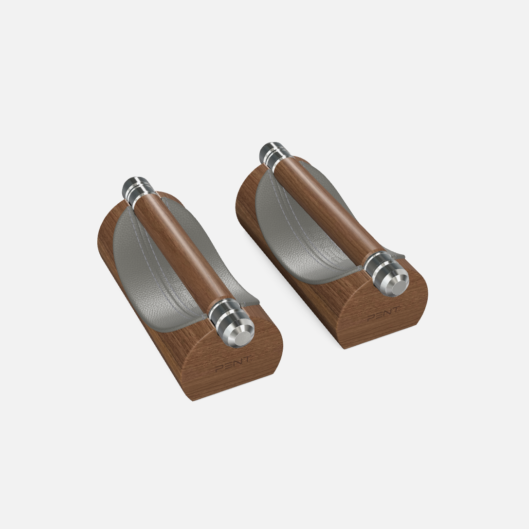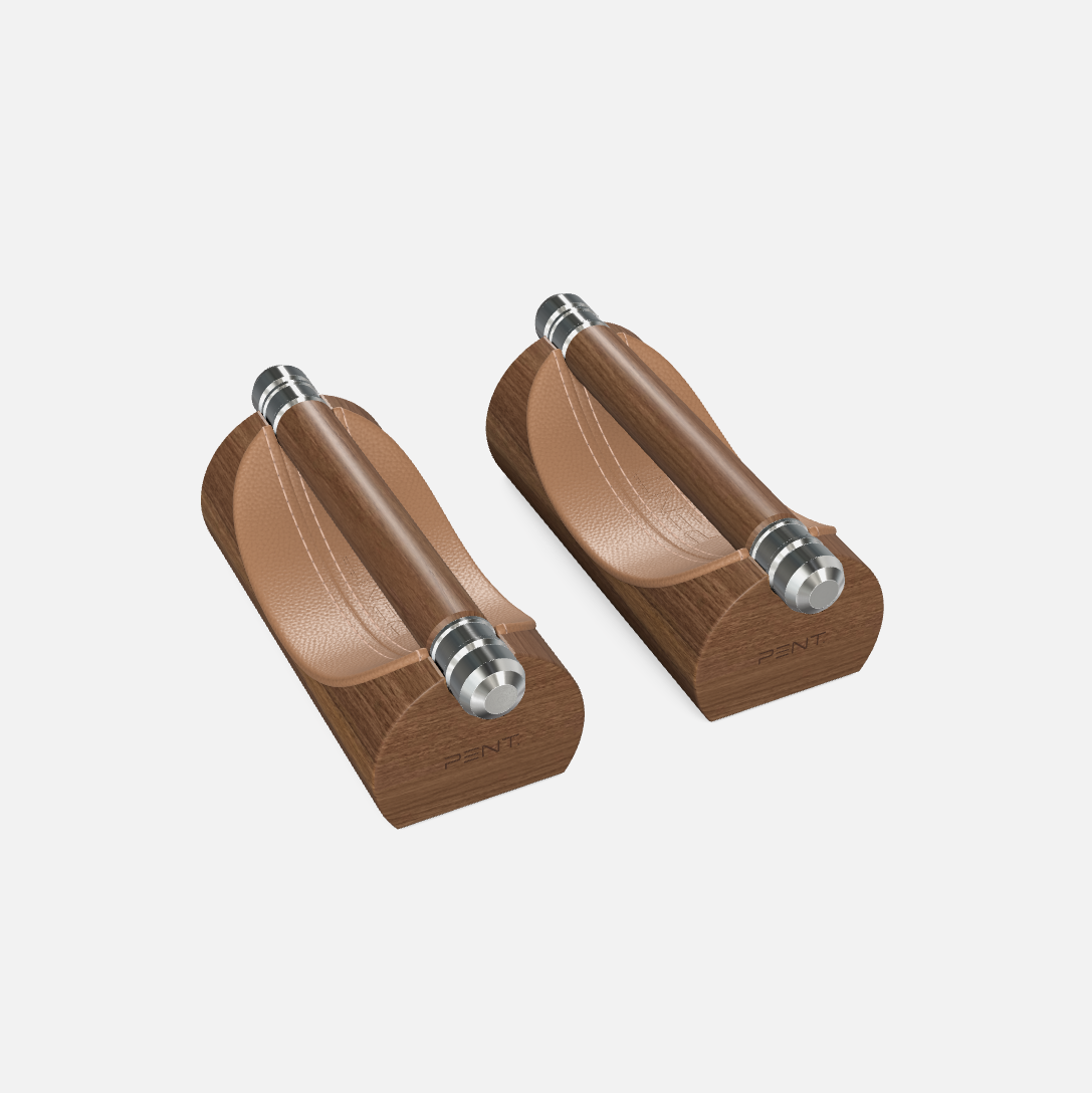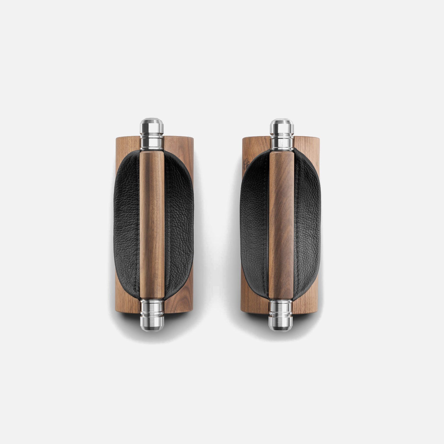 Primary photos are in the Natural Walnut wood finish and Black Leather.