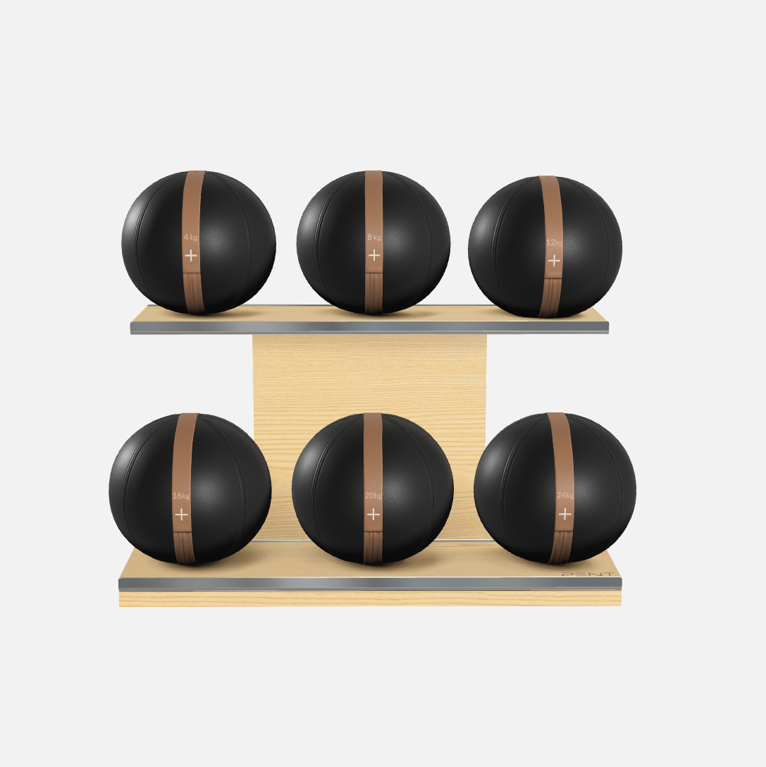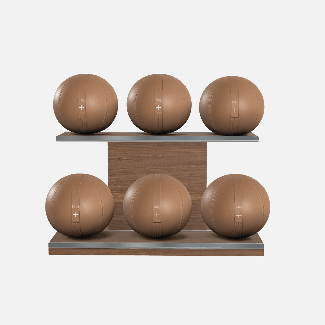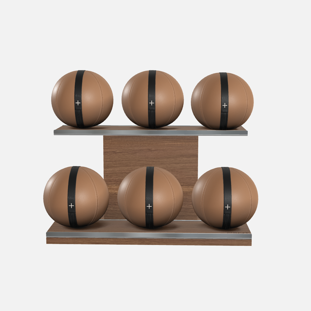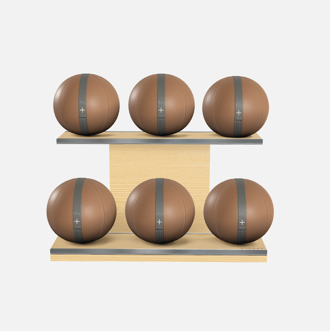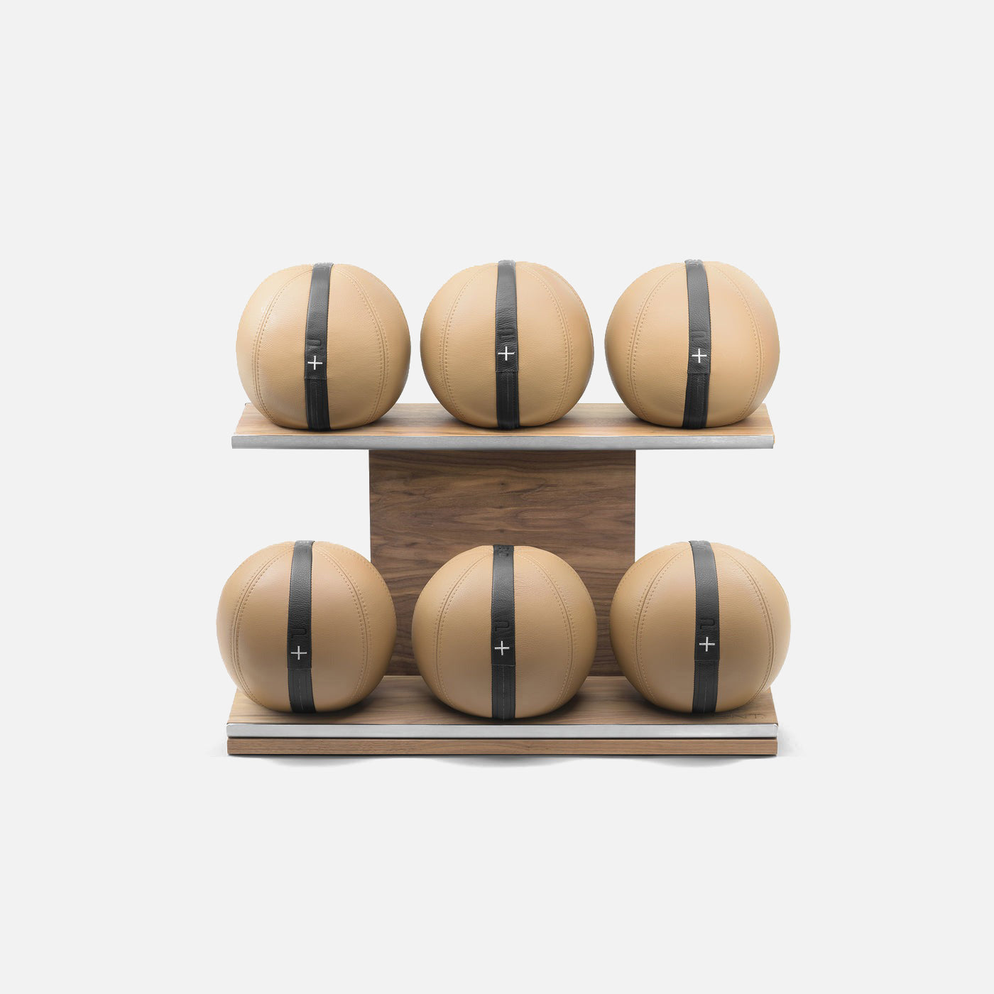 Moxa is a luxury medicine ball set hand made in Europe with real leather, with a minimal wood stand. Available in 5 leather colors, and 5 wood finishes.