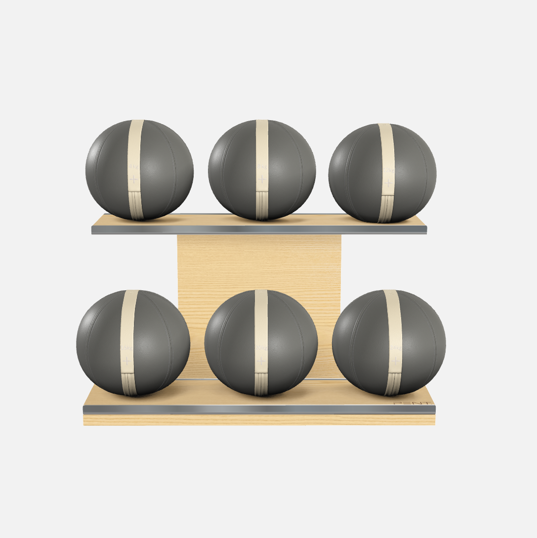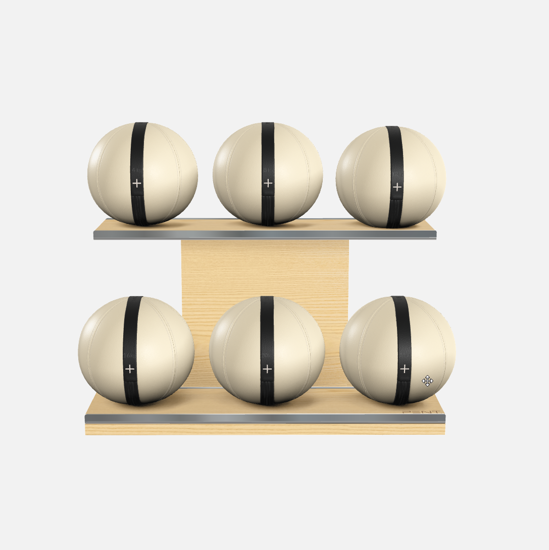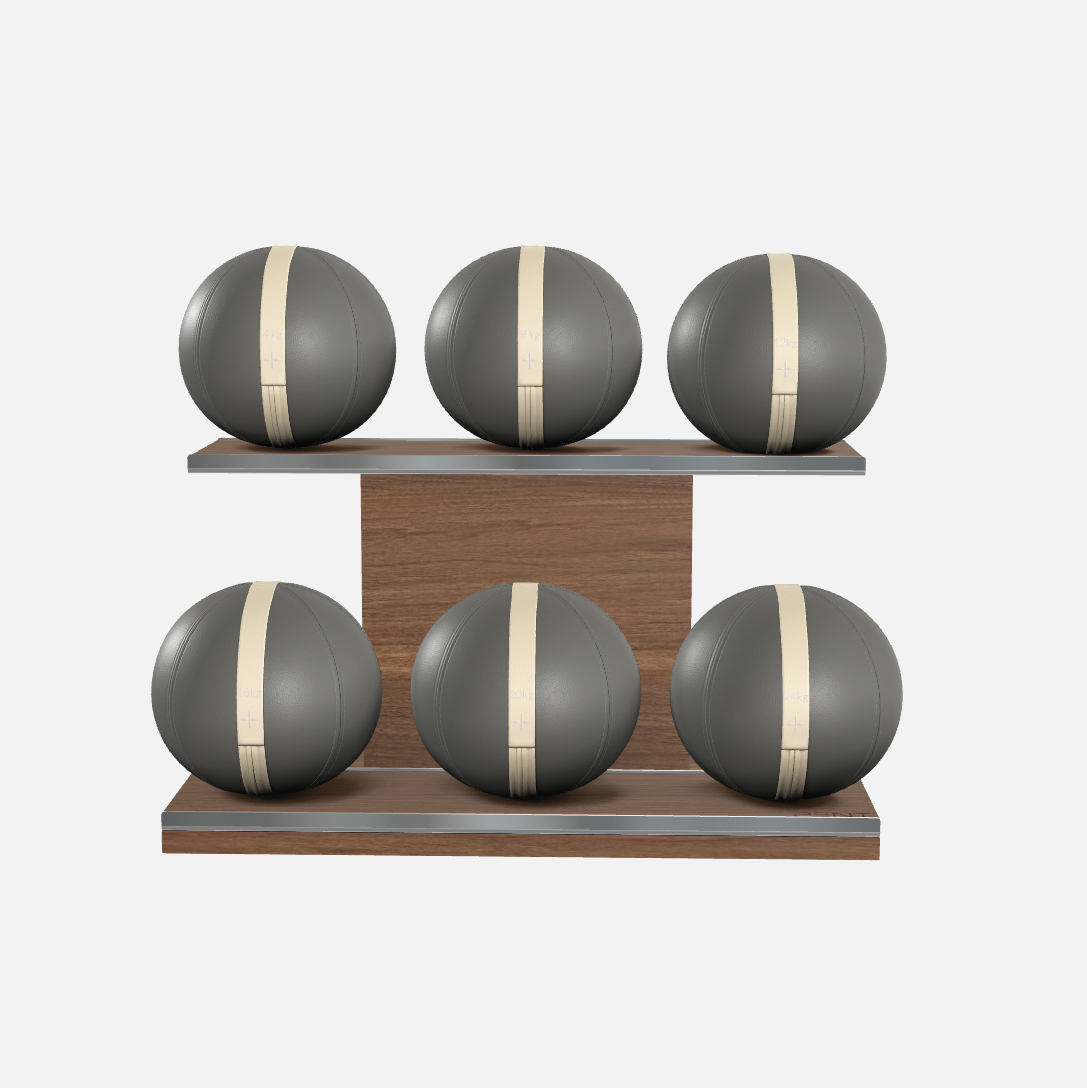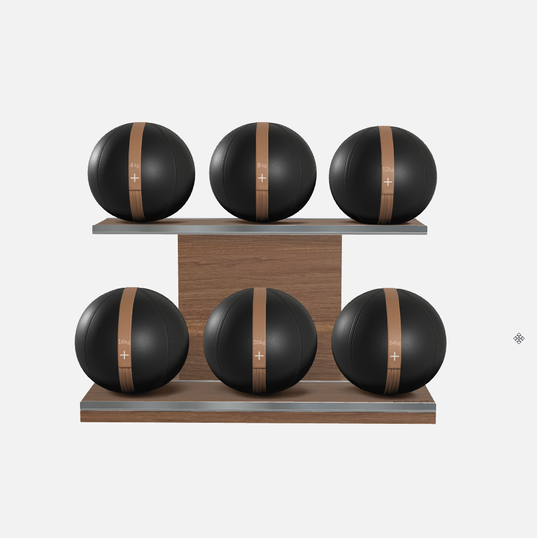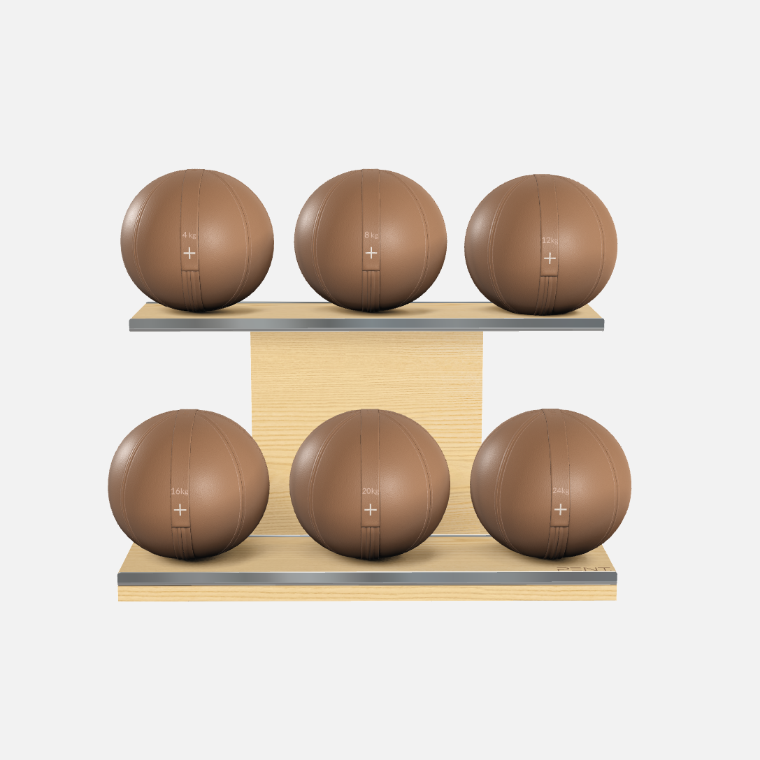 Moxa is a luxury medicine ball set hand made in Europe with real leather, with a minimal wood stand. Available in 5 leather colors, and 5 wood finishes.