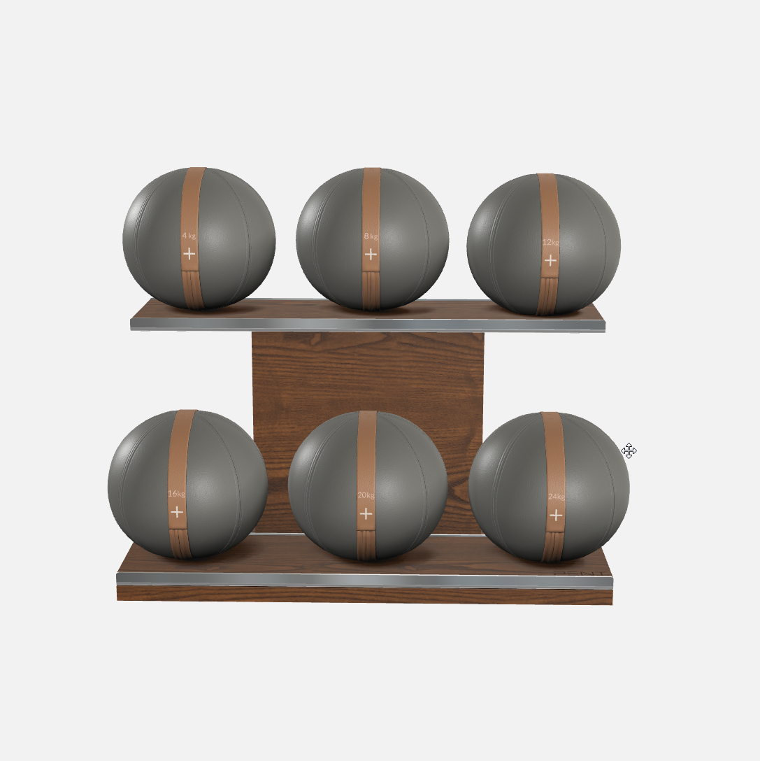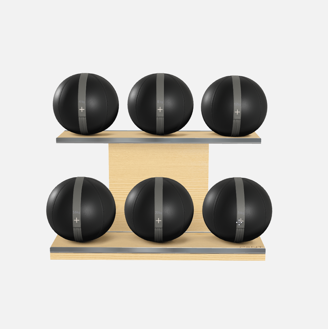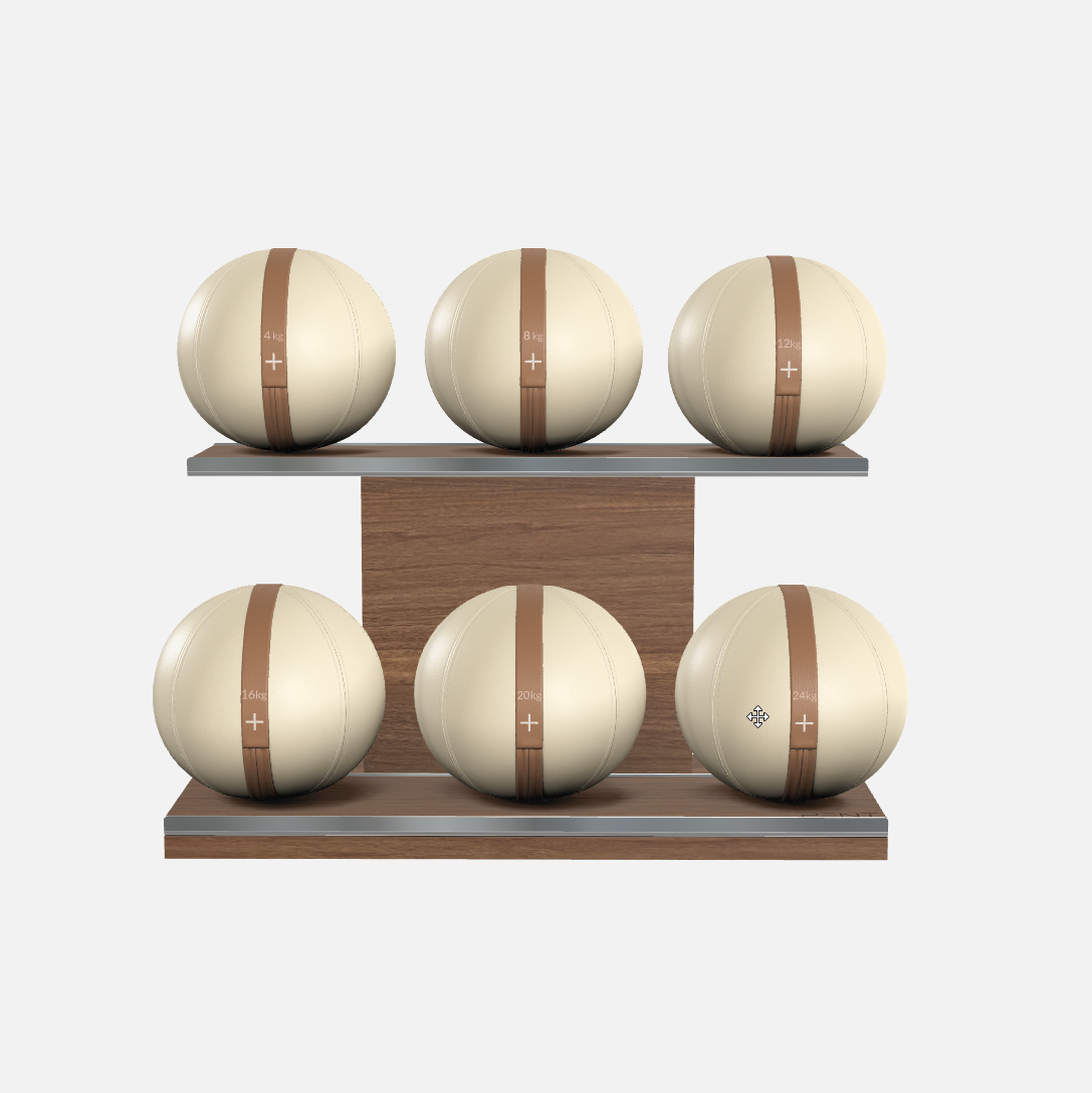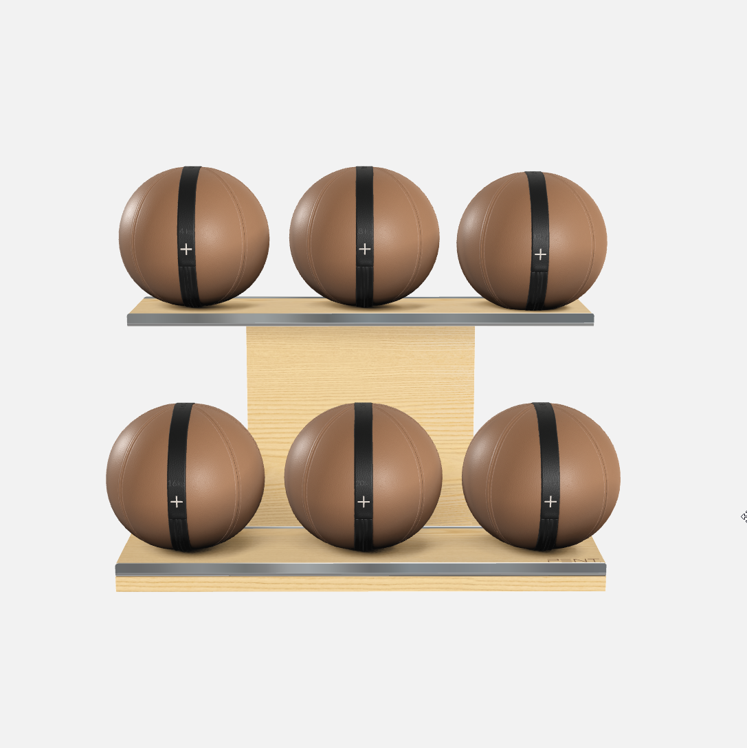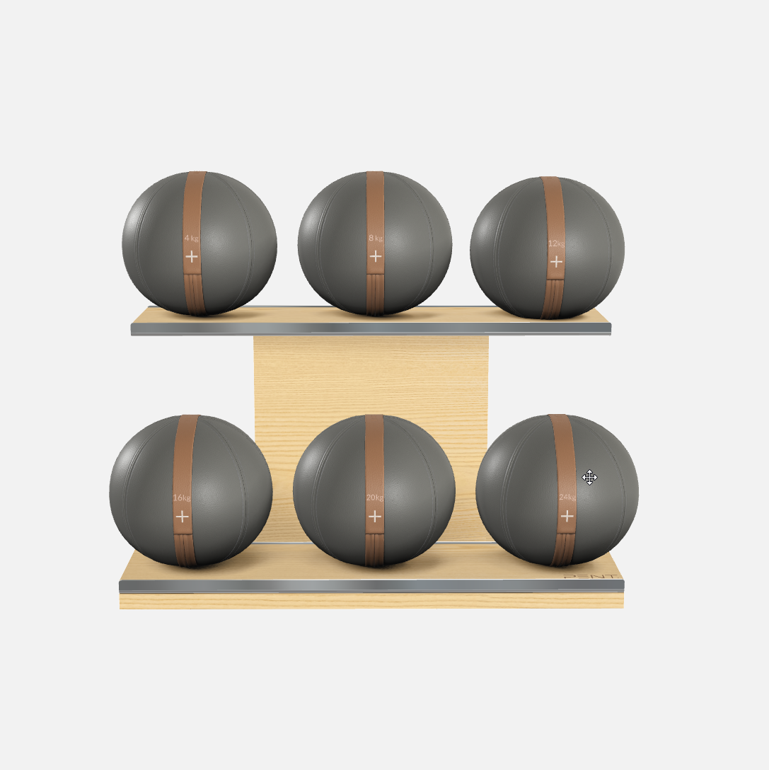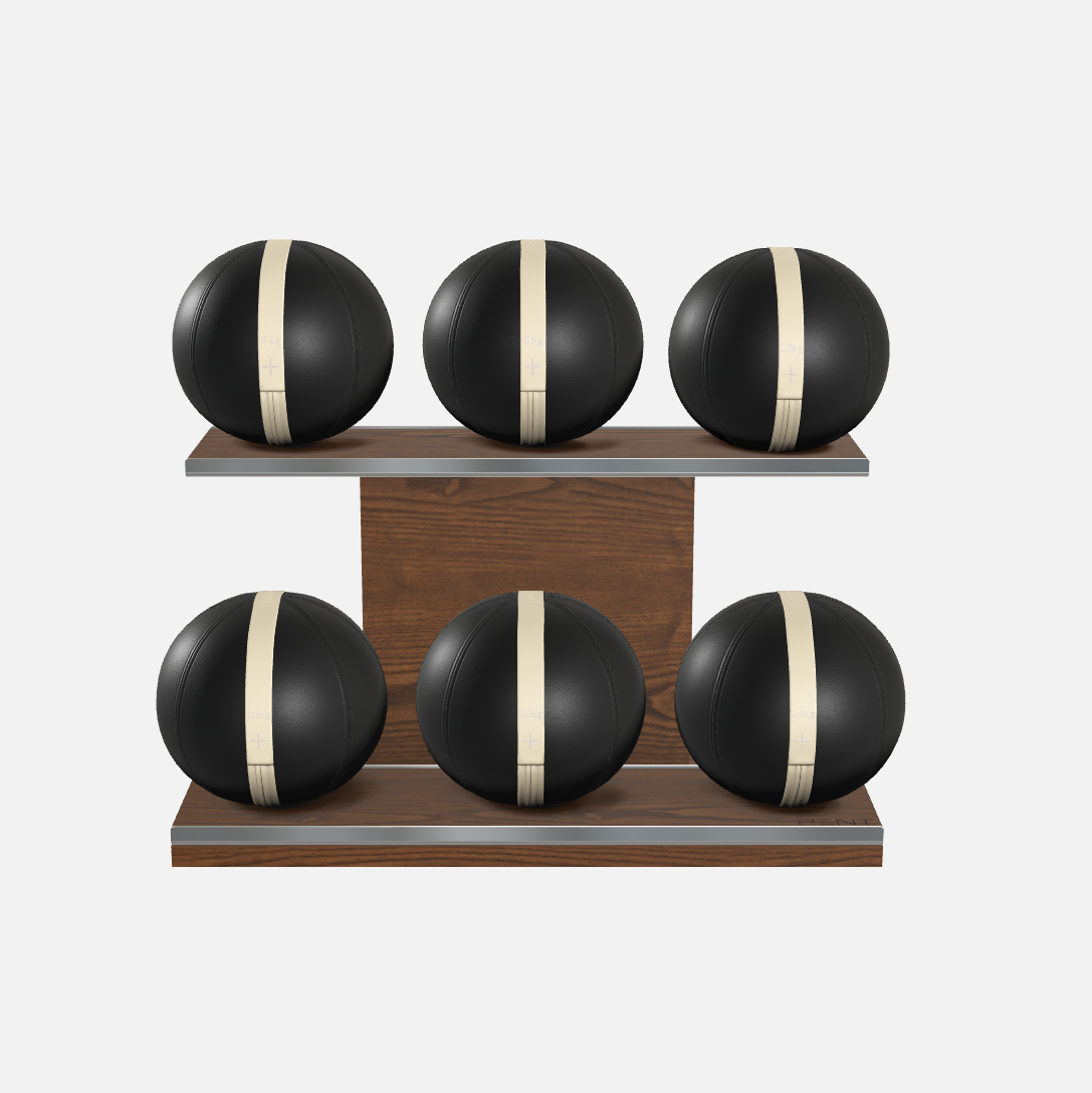 Moxa is a luxury medicine ball set hand made in Europe with real leather, with a minimal wood stand. Available in 5 leather colors, and 5 wood finishes.