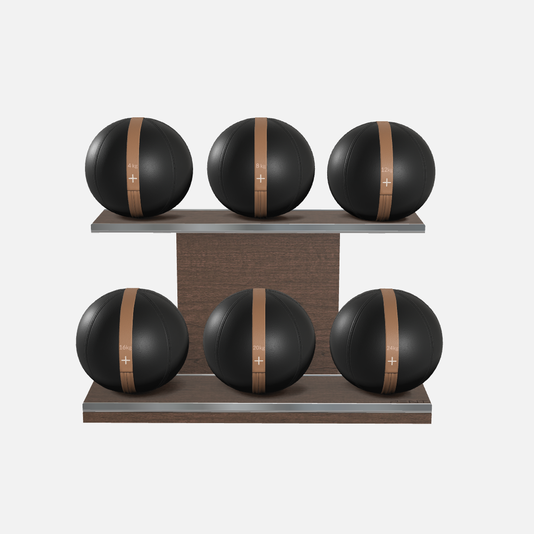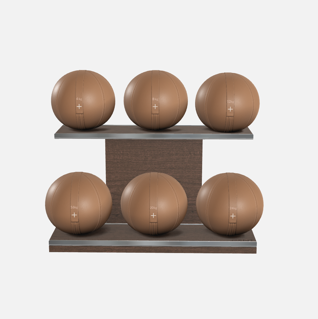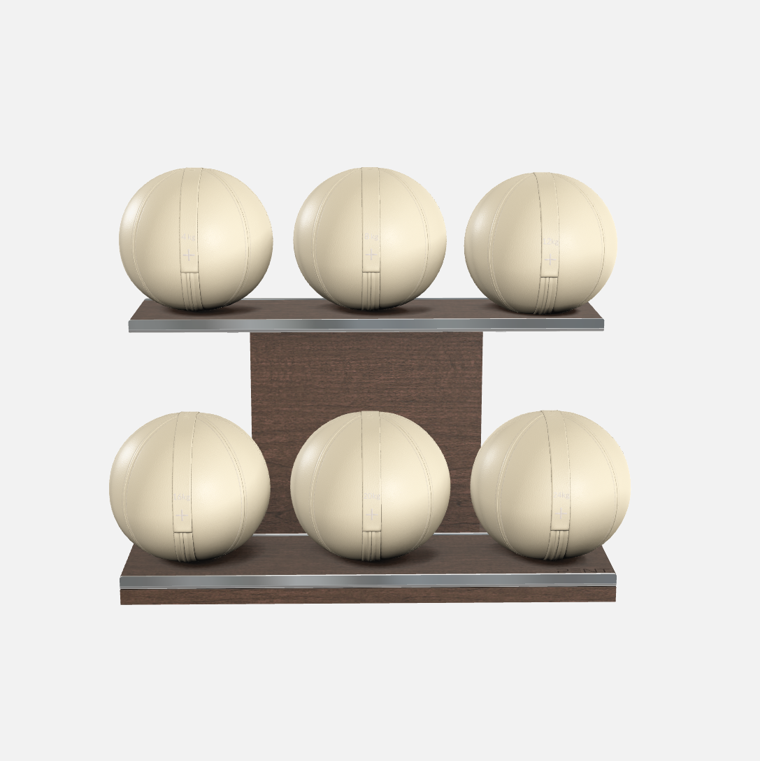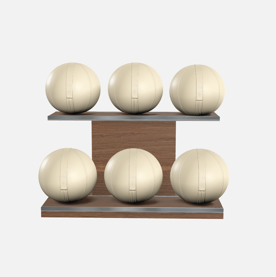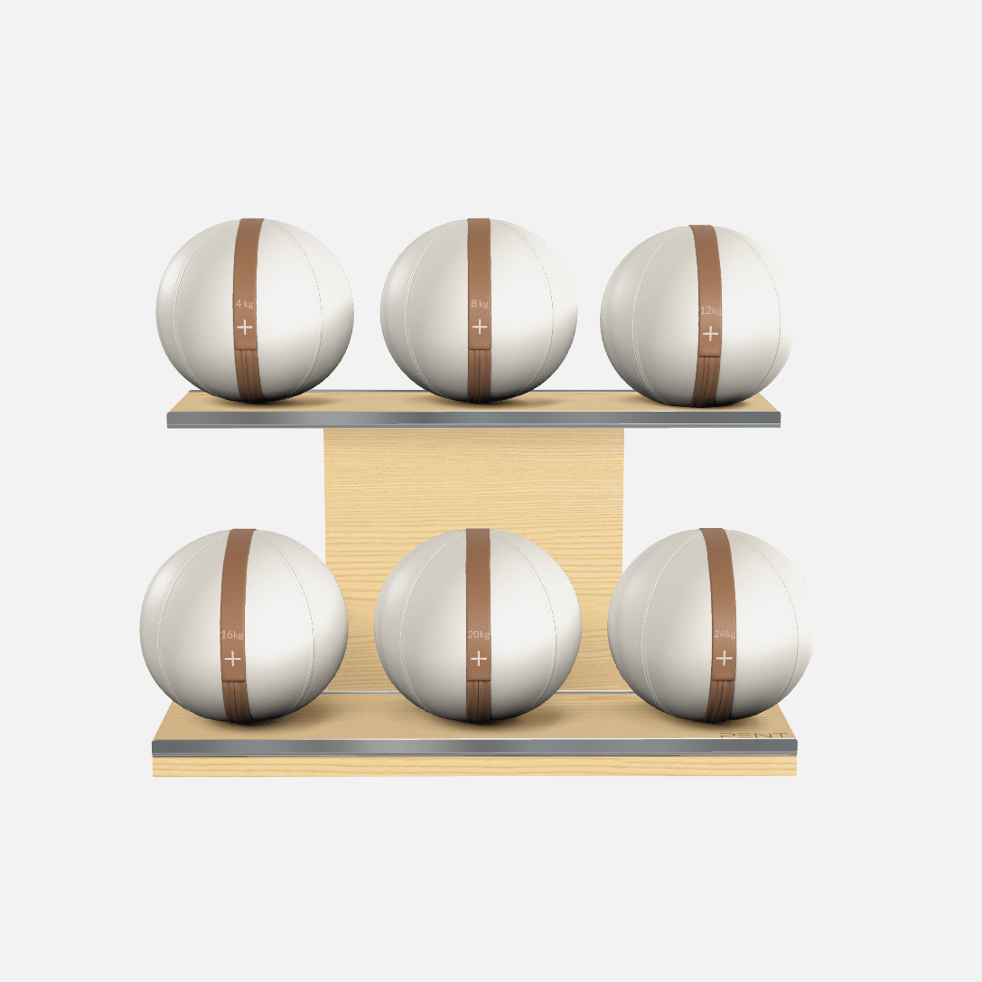 Moxa is a luxury medicine ball set hand made in Europe with real leather, with a minimal wood stand. Available in 5 leather colors, and 5 wood finishes.