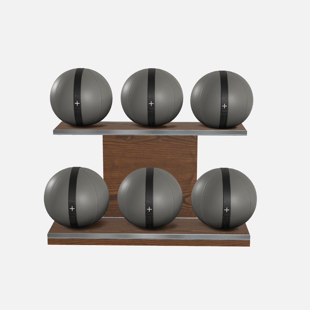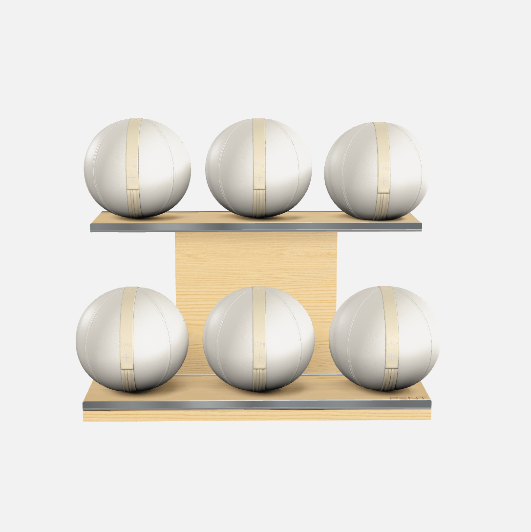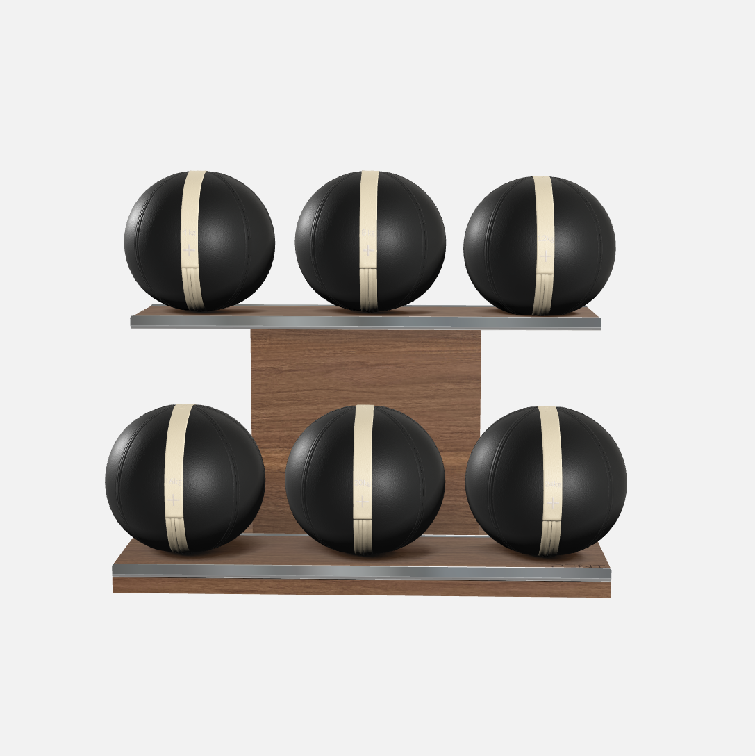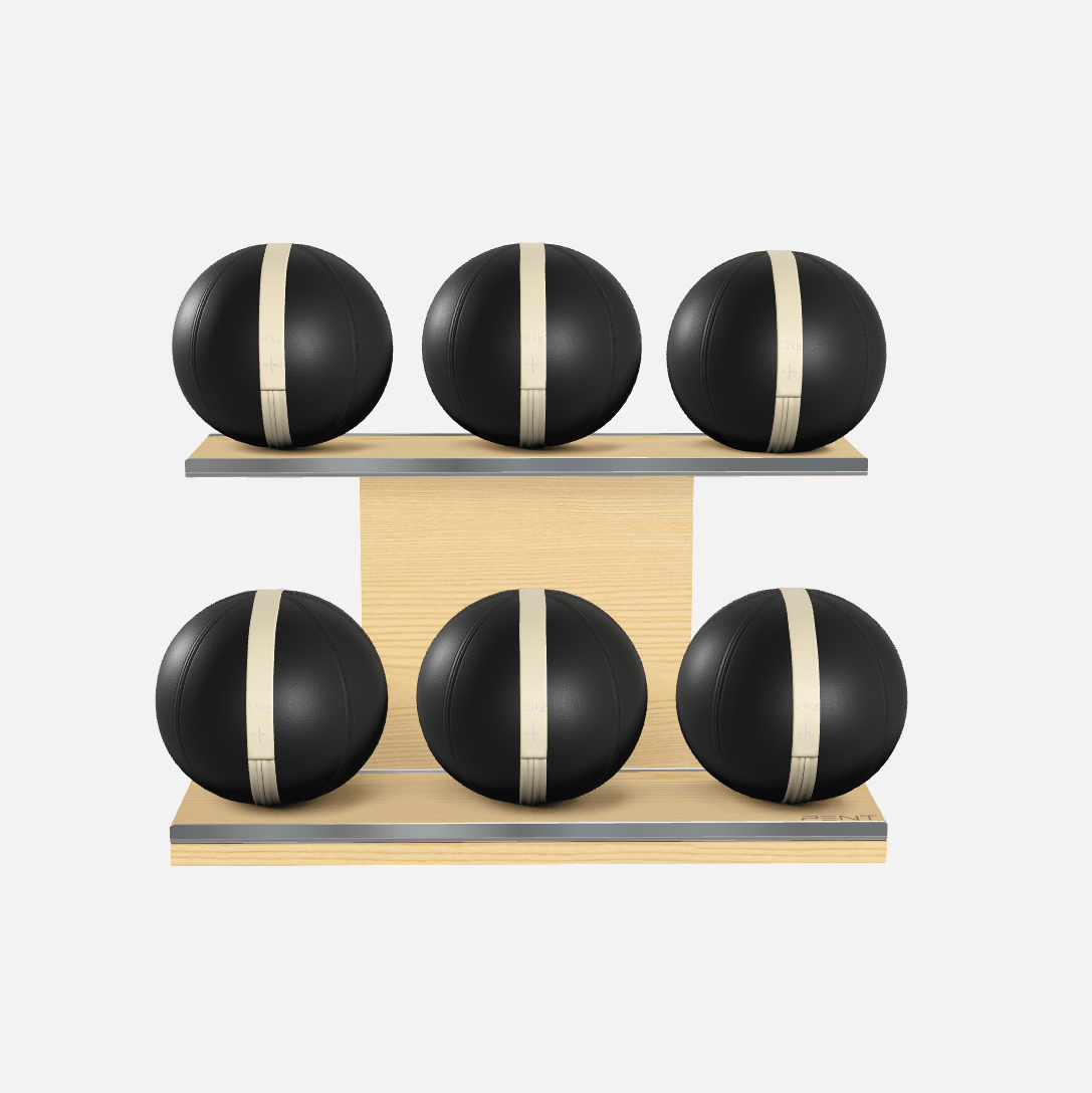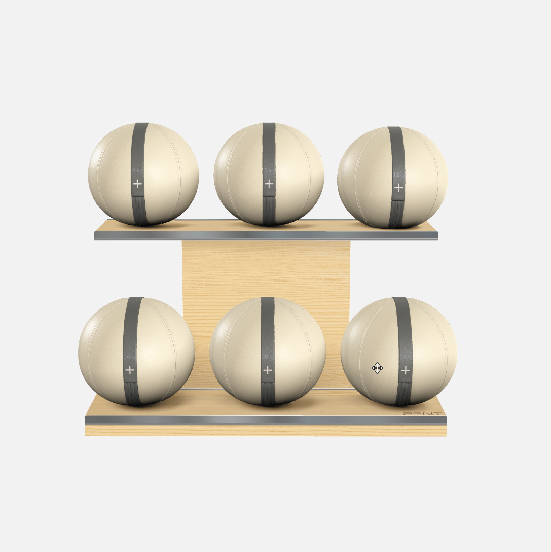 Moxa is a luxury medicine ball set hand made in Europe with real leather, with a minimal wood stand. Available in 5 leather colors, and 5 wood finishes.