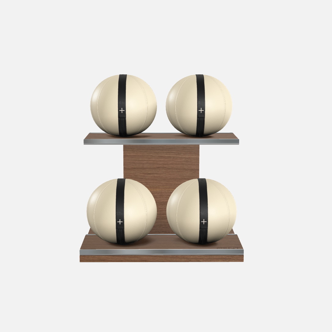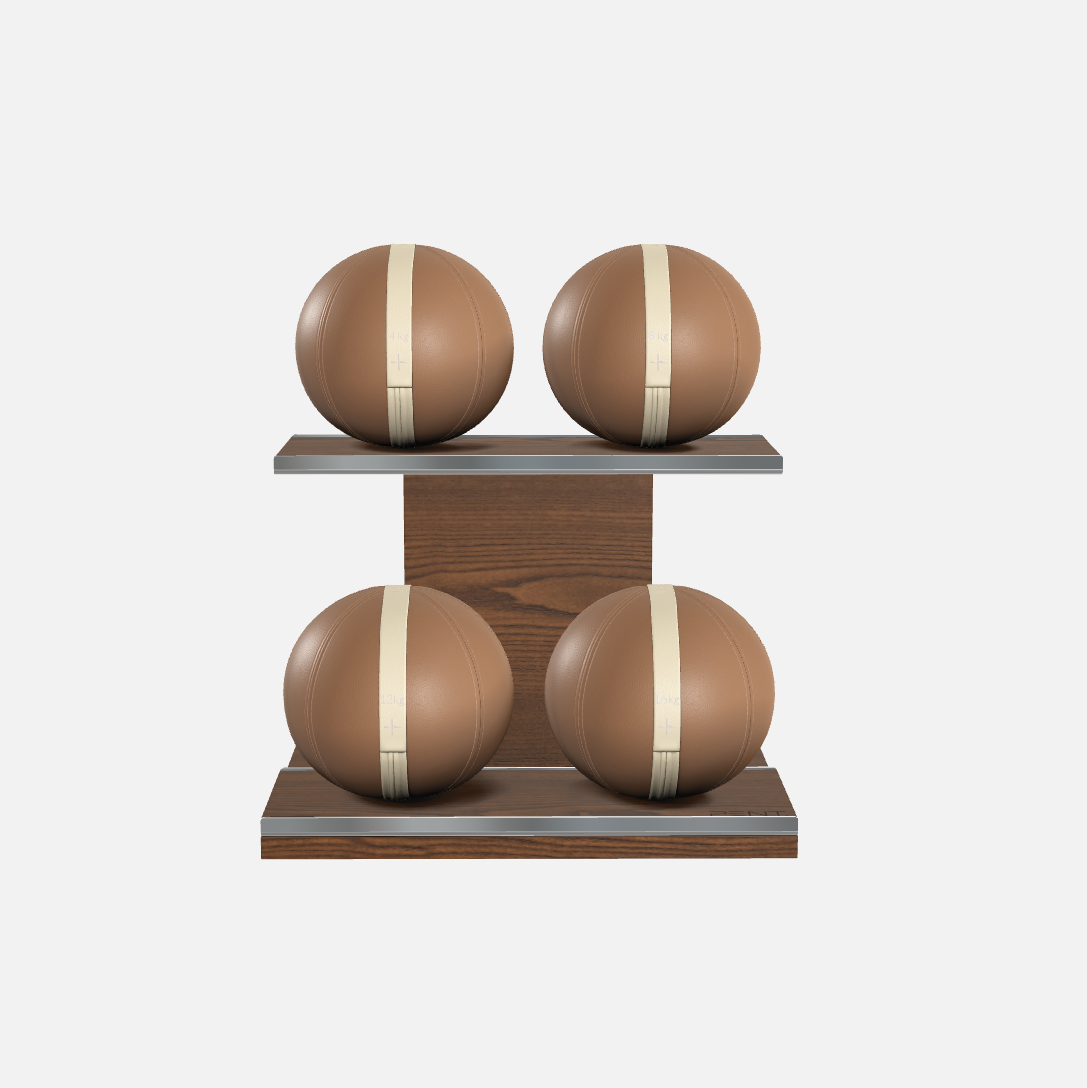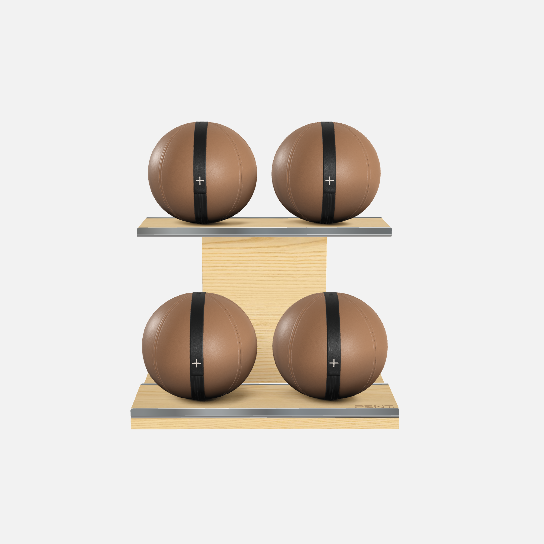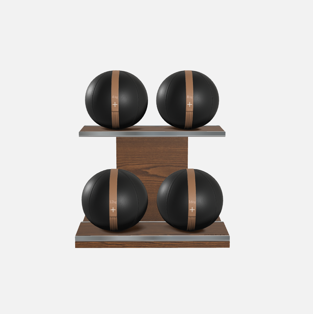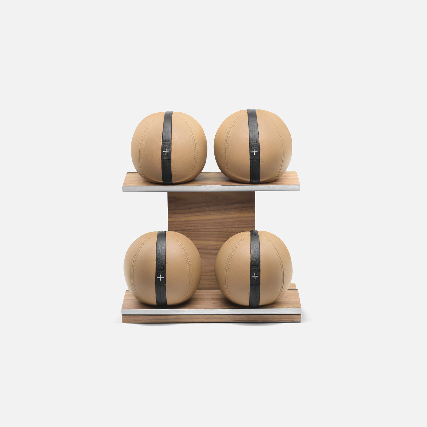 Moxa is a luxury medicine ball set hand made in Europe with real leather, with a minimal wood stand. Available in 5 leather colors, and 5 wood finishes.