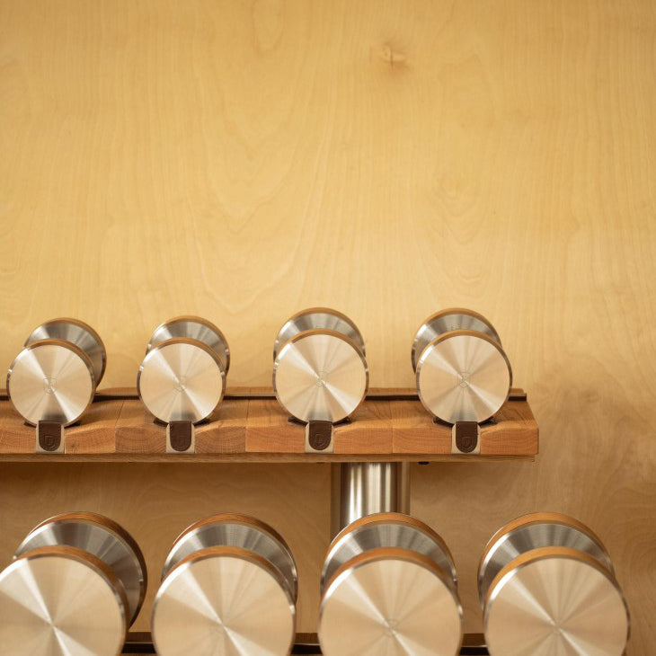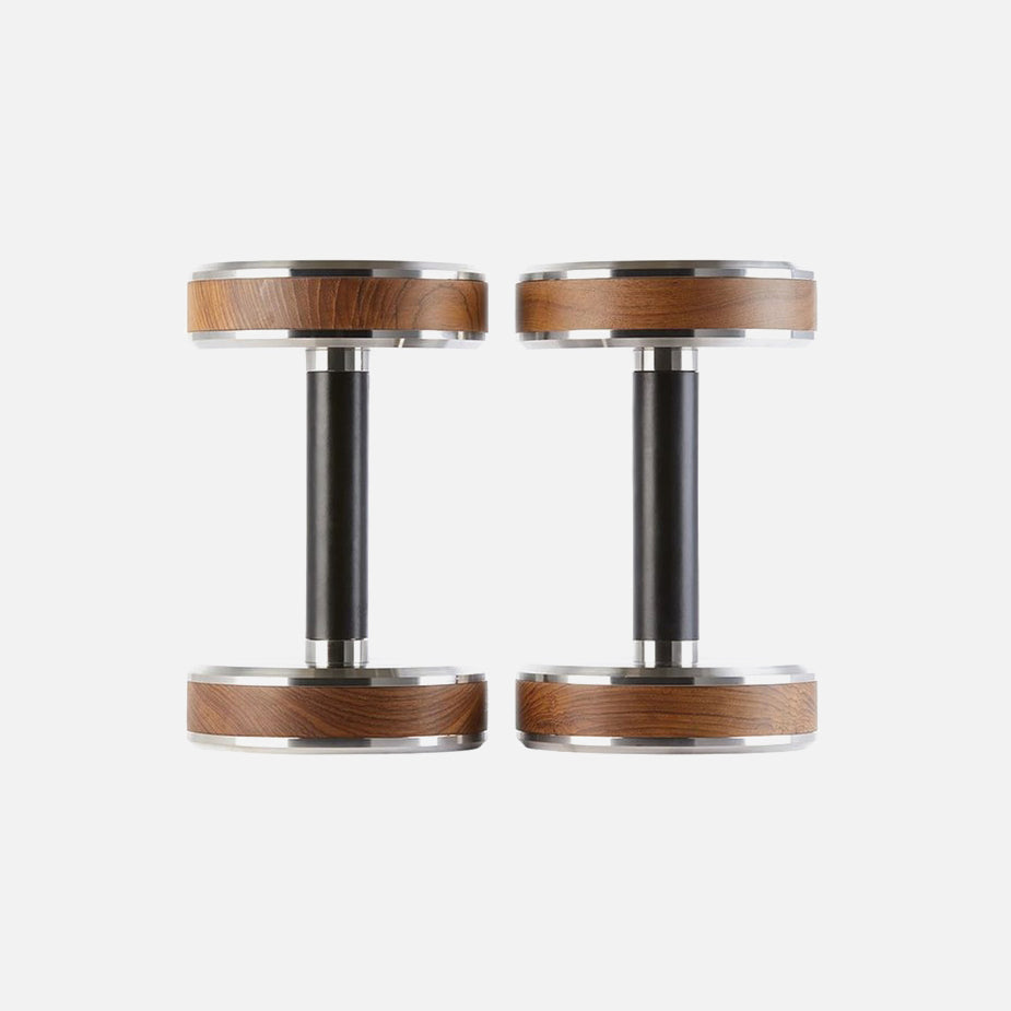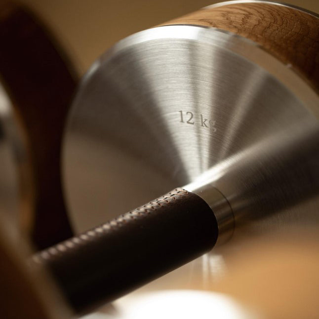 Elevating home fitness to an art form, the PEN™ dumbbell pairs distinctive stainless steel faces with meticulously hand-stitched leather handles. Each set features a sleek wooden body that reveals its own natural grain patterns, creating exercise equipment that's as individual as your fitness journey.