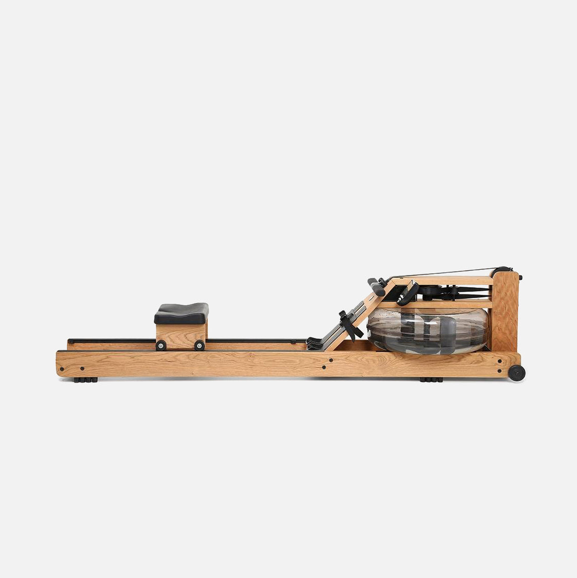 The WaterRower rowing machine is handcrafted in solid wood, and finished with Danish oil. Wood is an excellent material for this application due to its ability to absorb sound and vibration enhancing the WaterRower's smooth, quiet operation. The wood, as with all WaterRowers, features patented WaterFlywheel technology, unrivaled in its replication of the resistance felt in on the water rowing.